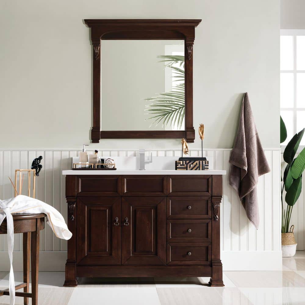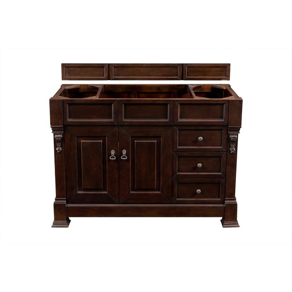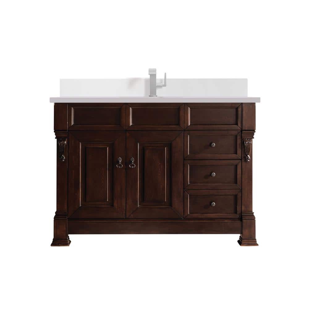 The Brookfield 48" Single Bathroom Vanity by James Martin Vanities combines classic design with modern functionality. Featuring a burnished mahogany finish, quartz top, and ample storage, it is perfect for enhancing any bathroom space.