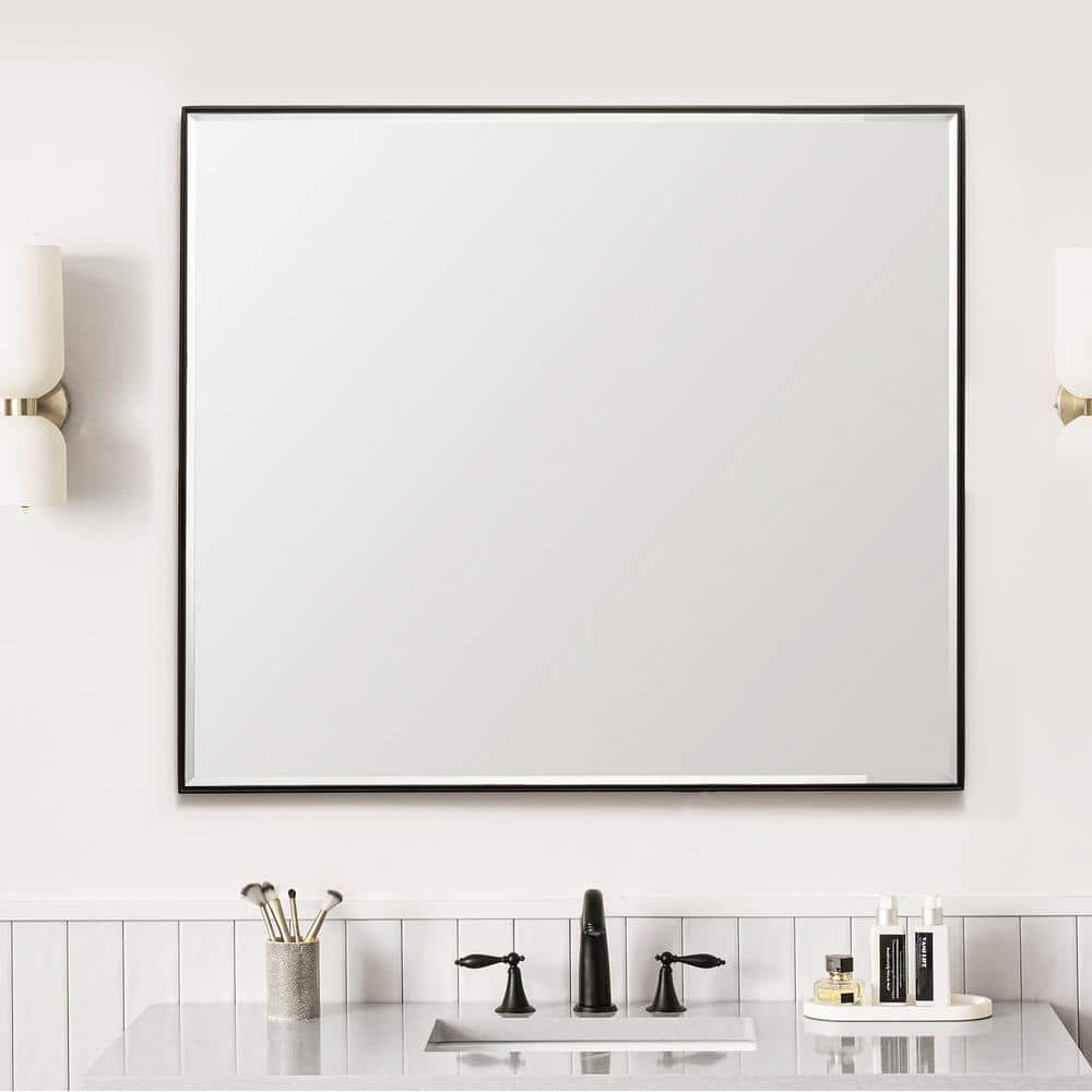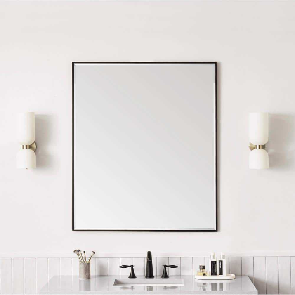 The James Martin Vanities Rohe Mirror features a sleek matte black finish and a modern rectangular design. Its beveled glass and stainless steel frame make it a durable and stylish addition to any bathroom or living space.