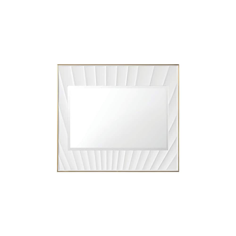 The Soleil Vanity Mirror by James Martin Vanities features a sculpted design resembling sun rays, with a matte white frame and gold accents. This elegant mirror is perfect for enhancing the aesthetic of any bathroom or living space.