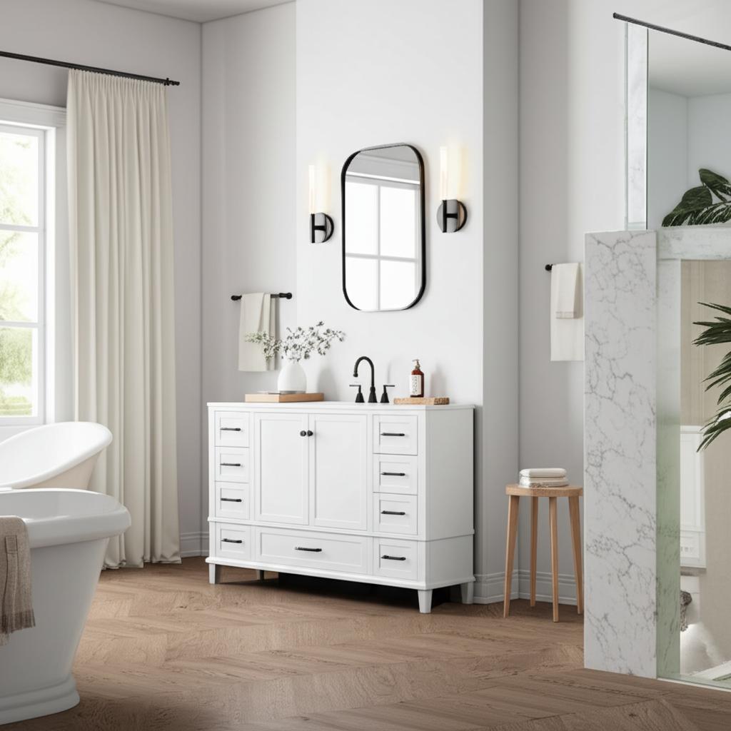 The Merryfield Vanity Cabinet combines elegant design with practical features, including soft-close drawers and doors, adjustable levelers, and a durable solid wood and MDF construction. Its sleek white finish and matte black hardware make it a stylish addition to any bathroom.