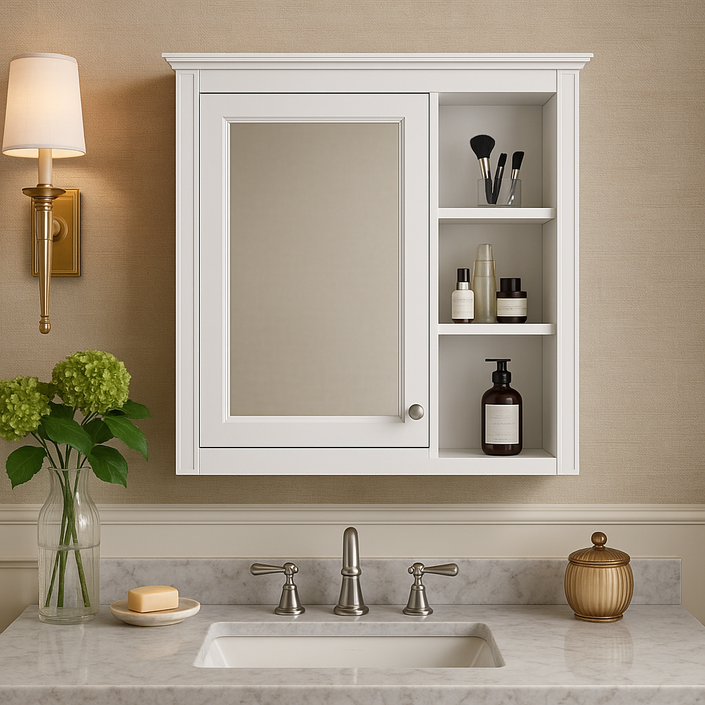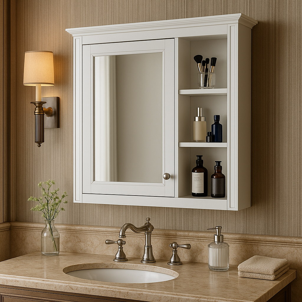 - Functional Storage: Includes three open shelves and a mirrored door.