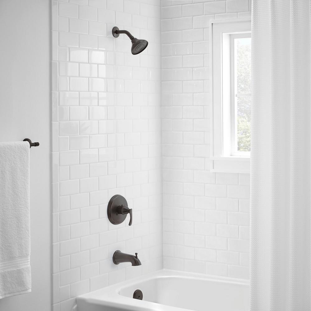 The Glacier Bay Edgewood Single-Handle 1-Spray Tub and Shower Faucet in Bronze has a classic, rich design that easily blends with multiple decorating styles. This fixture is built to maintain a constant temperature for a safe and comfortable shower experience. WaterSense certified, this efficient faucet features a 1.8 GPM flow rate to help reduce water use. The Ceramic disc cartridge provides drip free operation so you can enjoy smooth operation day after day.
