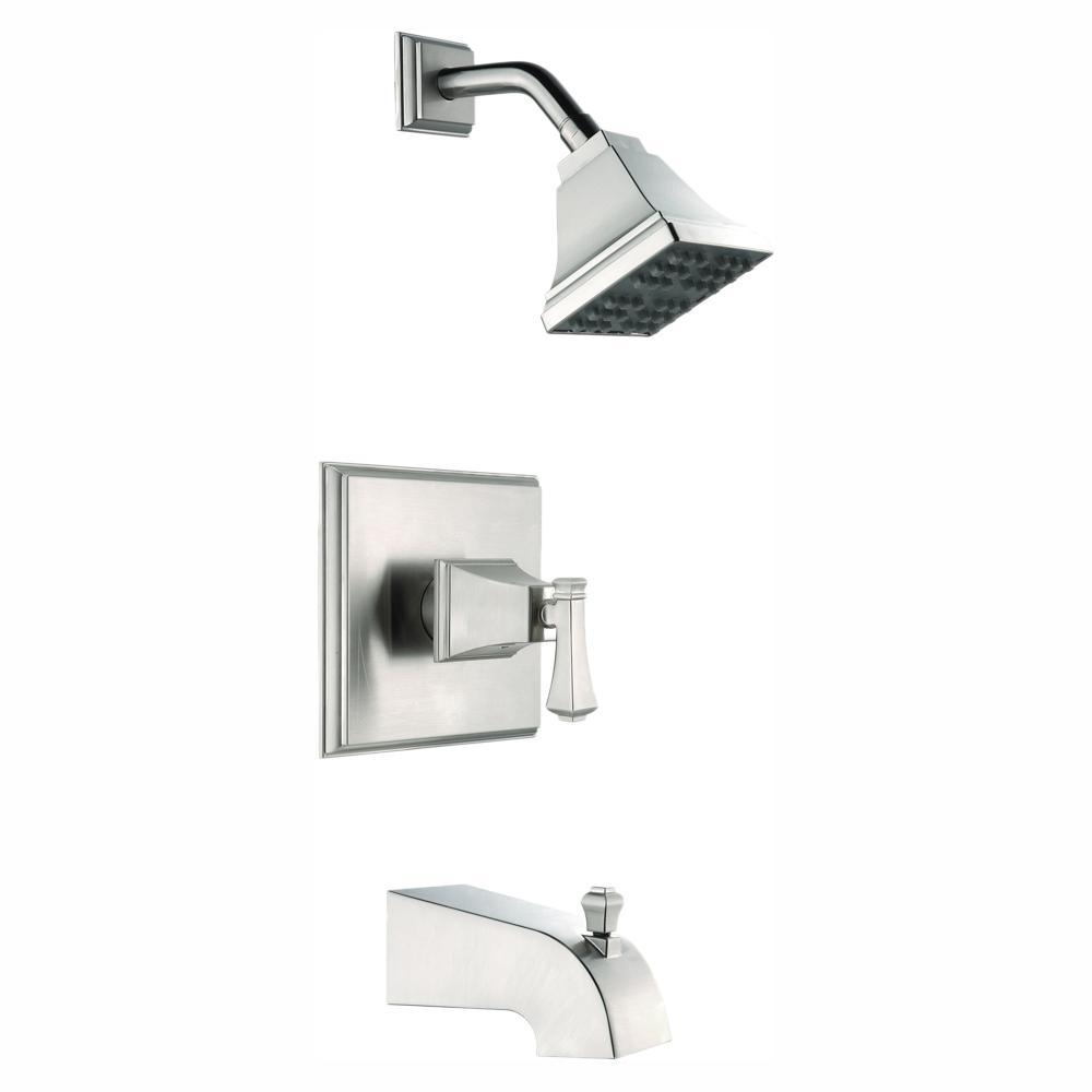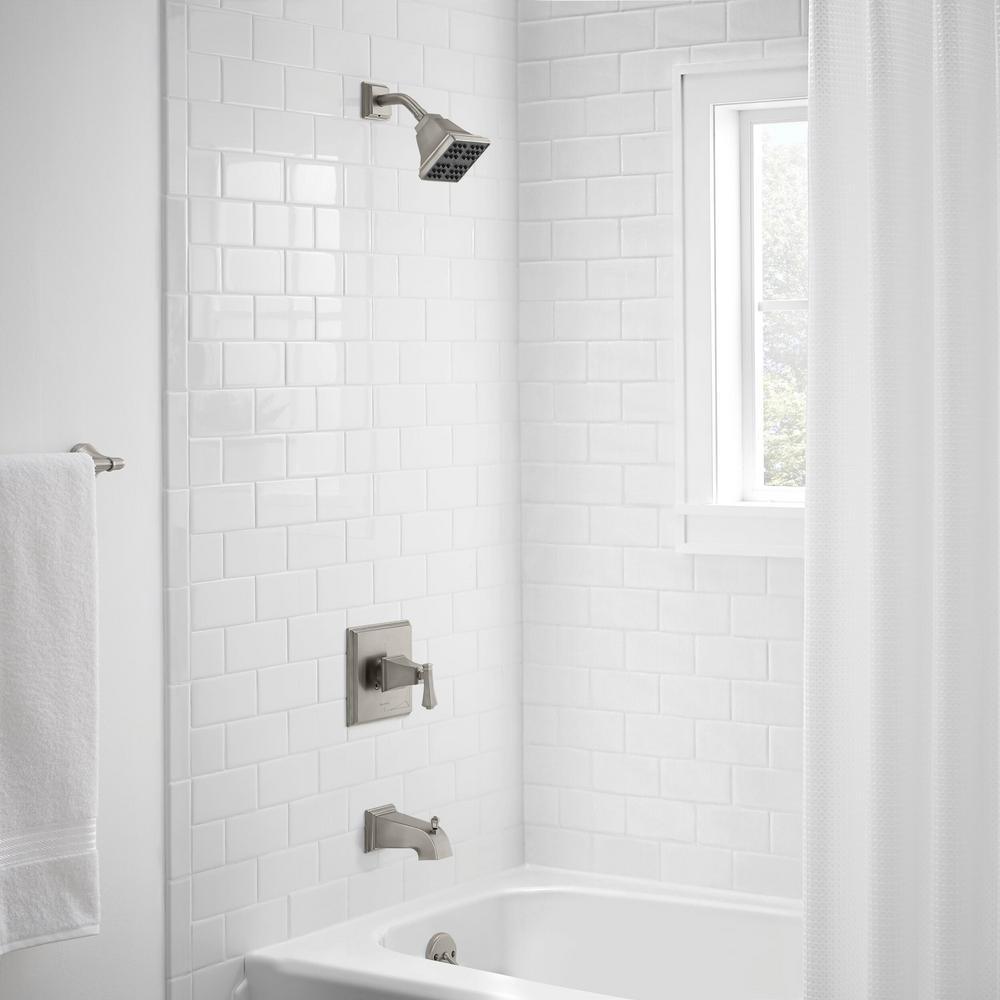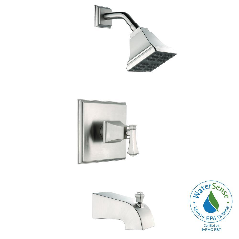 The Glacier Bay Exhibit Single-Handle 1-Spray Tub and Shower Faucet in Brushed Nickel offers a sophisticated style with crisp lines. With its notable detailing, this tub and shower set features a single handle with a decorative tub spout and showerhead design. Inspired from past generations. This faucet features a smooth ADA compliant lever handle and a ceramic disc valve to ensure drip-free operation. It is WaterSense certified with a 1.8 GPM flow rate to reduce water use without sacrificing performance. The Exhibit tub and shower faucet will showcase any bathroom with its popular brushed nickel finish. Exhibit makes a true style statement and shows how symmetry meets luxury.