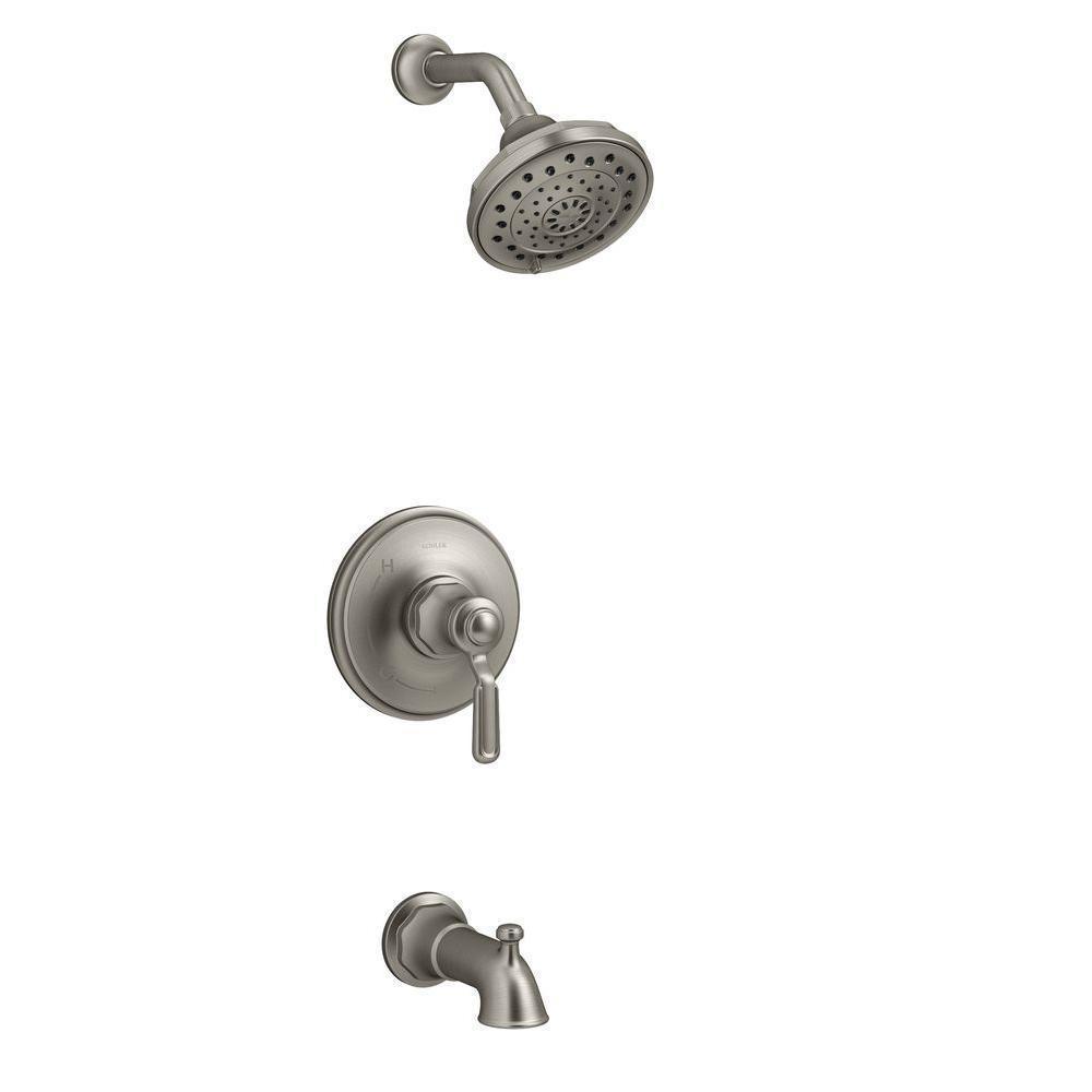 Inspired by vintage metalwork, Worth faucets combine bold facets and intricate detailing for an industrial chic look. With a handcrafted aesthetic, this bath and shower trim brings relaxed sophistication to traditional decor as well as modern designs that embrace classic elements. It includes a multifunction showerhead, Rite-Temp pressure-balancing valve, single lever handle and bath spout.