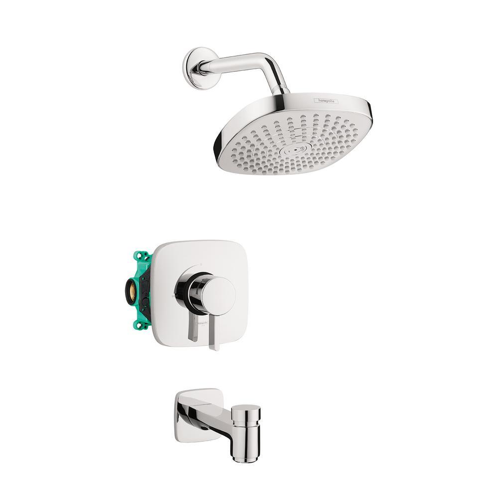 • Total system in one box: Croma select E 180 rain and intense rain showerhead, 9 in. showerarm, Ecostat E pressure balance shower trim, Logis tub spout with diverter, ibox universal plus rough