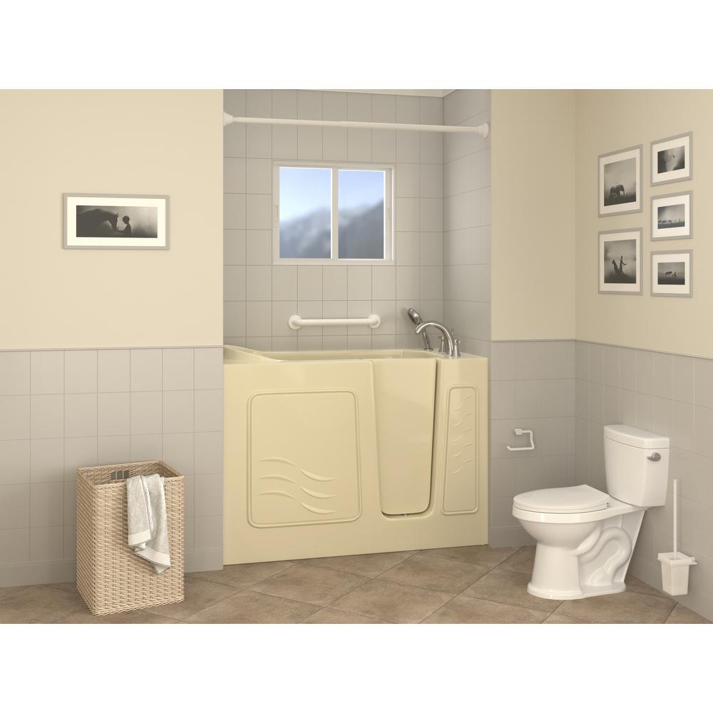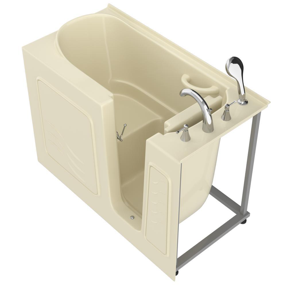 A compact, ADA-ready walk-in soaking tub engineered for safe, independent bathing. The glossy biscuit gelcoat over fiberglass and a steel support frame provide durability, while the fast-fill faucet set and handheld sprayer deliver quick, convenient use.