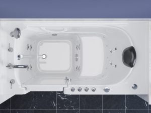 A secure, ADA-ready walk-in whirlpool tub designed for comfort and fast convenience. The HD Series features a pressure-sealed 90° swing door, quick-fill faucet set, and powered fast drain for shorter bath cycles.