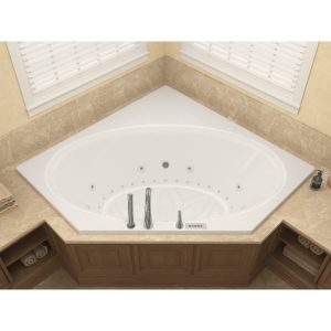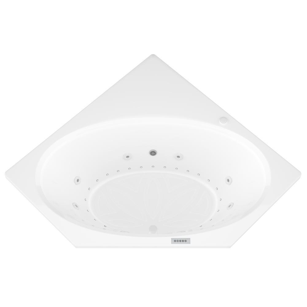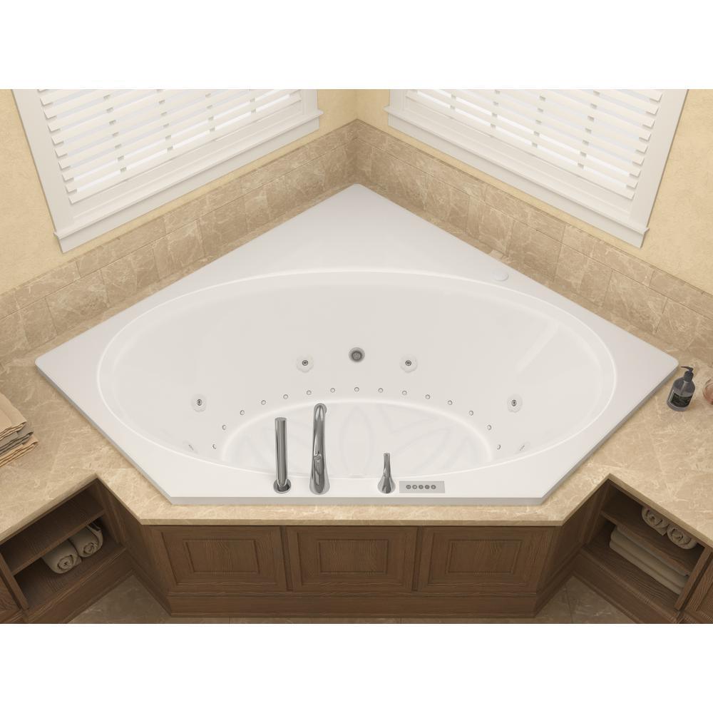 A luxurious corner drop-in tub crafted from glossy white marine-grade acrylic with fiberglass reinforcement. Features dual hydrotherapy with 8 adjustable whirlpool jets and 27 Acu-Stream air jets, plus aromatherapy, chromatherapy, maintenance heater, and O3 ozonator for a clean, comfortable soak.