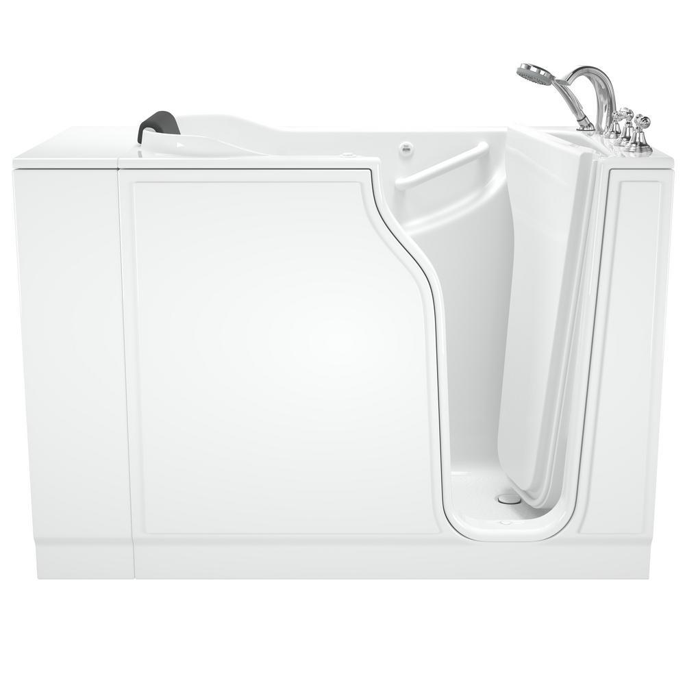 The American Standard 30 in. x 52 in. Gelcoat walk-in bath provides a similar bathing experience to larger models but fits in smaller spaces and uses less water. The included tub extender allows this tub to retrofit in the same space as a standard bathtub. The full sized, V-shaped door with a low door threshold allows ease of entry and exit. Fully equipped, the 109 Premium Series offers all the latest in safety and comfort features with the most advanced therapeutic options and backed by a lifetime warranty on the door seal, a 10 year warranty on the tub shell and a 5 year warranty on all other components.