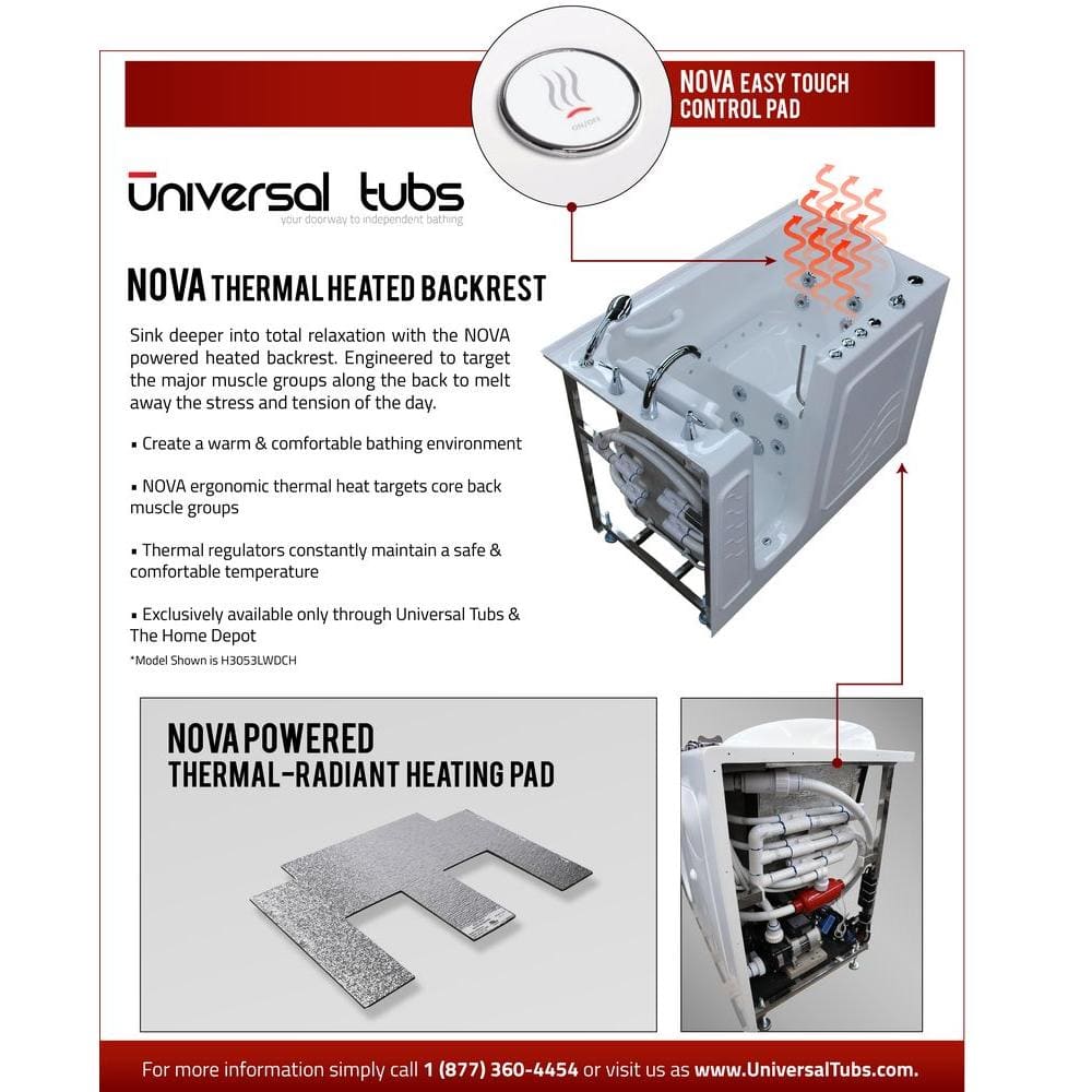 Enjoy safer, spa-like bathing with the Universal Tubs Nova Heated walk-in whirlpool tub. The acrylic alcove-style tub features a heated backrest and six adjustable water jets powered by a 1 HP pump to soothe muscles while maintaining water temperature. A wide, inward-swinging door with a watertight seal and slip-resistant floor promotes confident entry and exit.