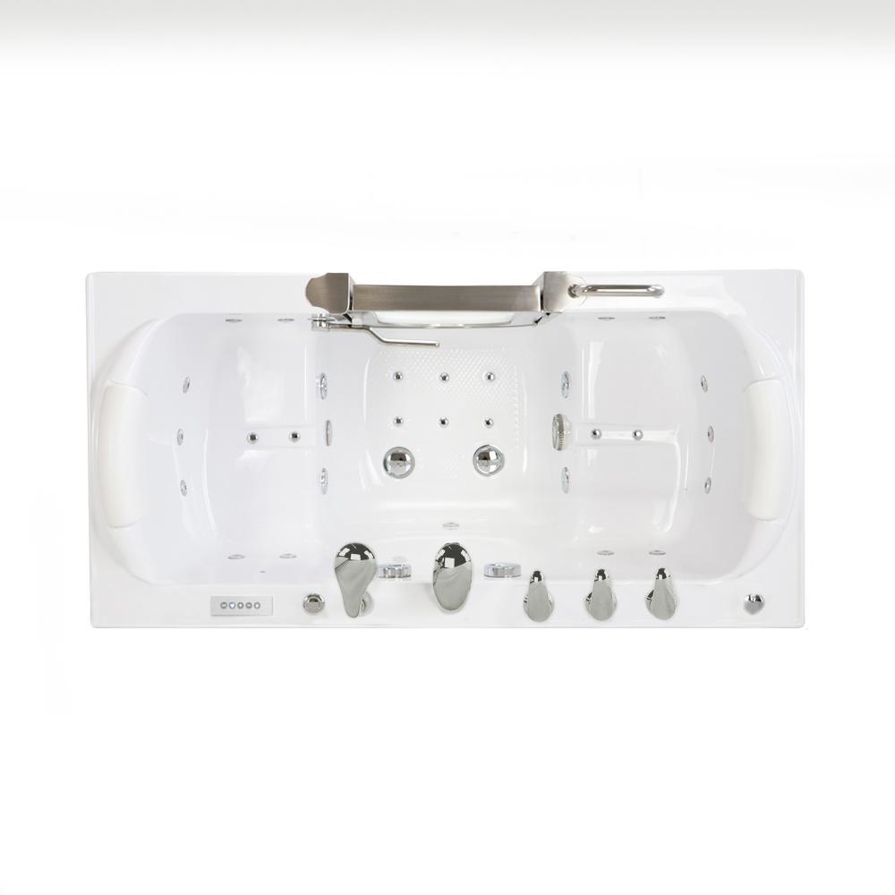 A two-seat walk-in bathtub designed for standard 60-inch alcoves, delivering whirlpool, air, and MicroBubble therapies with a fast-fill faucet and dual drain technology. Features an inward-swing stainless steel and tempered glass door, digital controls, and a heated seat for comfort and safety.