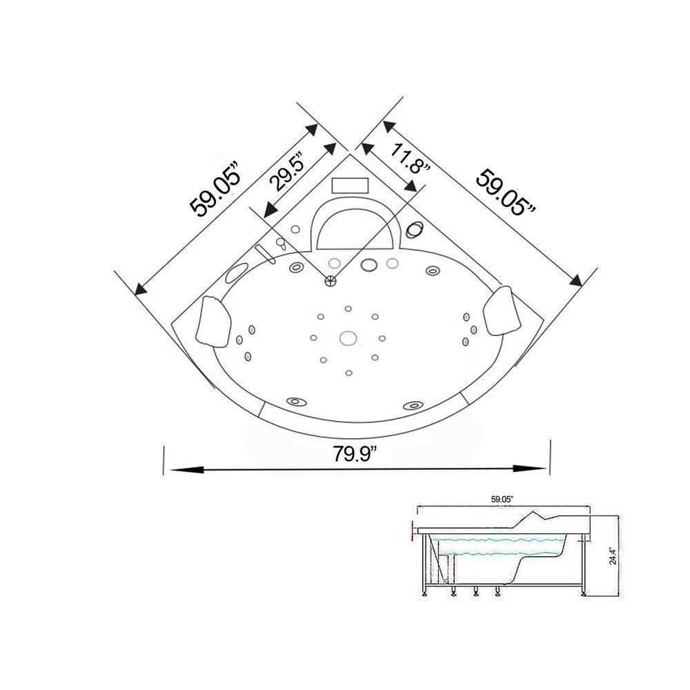 Whirlpool bathtub 59.05 in. x 59.05 in. hot tub double pump with heater and Bluetooth - Sant’Angels. 2 person Whirlpool bathtub with heater and Bluetooth: Size 59.05 in. L x 59.05 in. W x 22 in. High. Technical specifications: Bath tub size: base 59.05 in. L x 59.05 in. W x 22 in. High Water Jet Pump (1HP, 750-Watt) Drain placement: reversible (all installations are possible) Integrated heater to keep the water temperature constant Bluetooth connection system to listen all music directly in the tub 4 adjustable massage 12 Whirlpool jets 250-Watt Air pump with 8 air nozzles 8-pieces front apron lights (changing colors) Air jet control system 3 Big LEDs underwater light 2 Padded headrests Control panel(computer) Radio FM 2 Loudspeakers Shower Wand Waterfall Faucet Cold and hot water faucet included One Switch Towel rack piece back-water valve Power 110-Volt - 25 Amp Electric leakage protection system (automatic circuit breaker) Weight: 220 lbs. Color Bathtub: White high quality sanitary acrylic bath tub Steel frame Front glass.