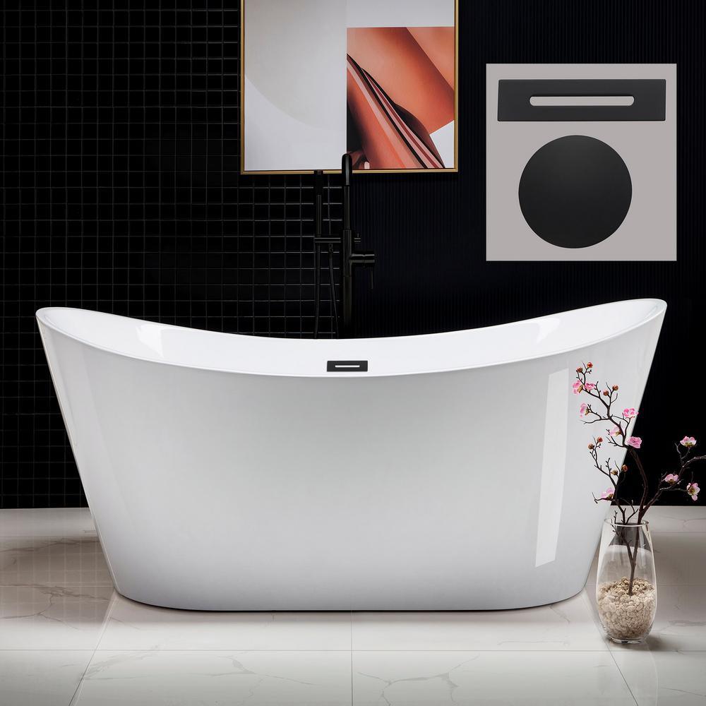 A freestanding 67-inch double-slipper soaking bathtub crafted from high-gloss LUCITE acrylic, reinforced with fiberglass for durability. Features an integrated sealed drain and overflow in chrome, double-walled insulation, and a non-slip bottom for safer, cozier baths.