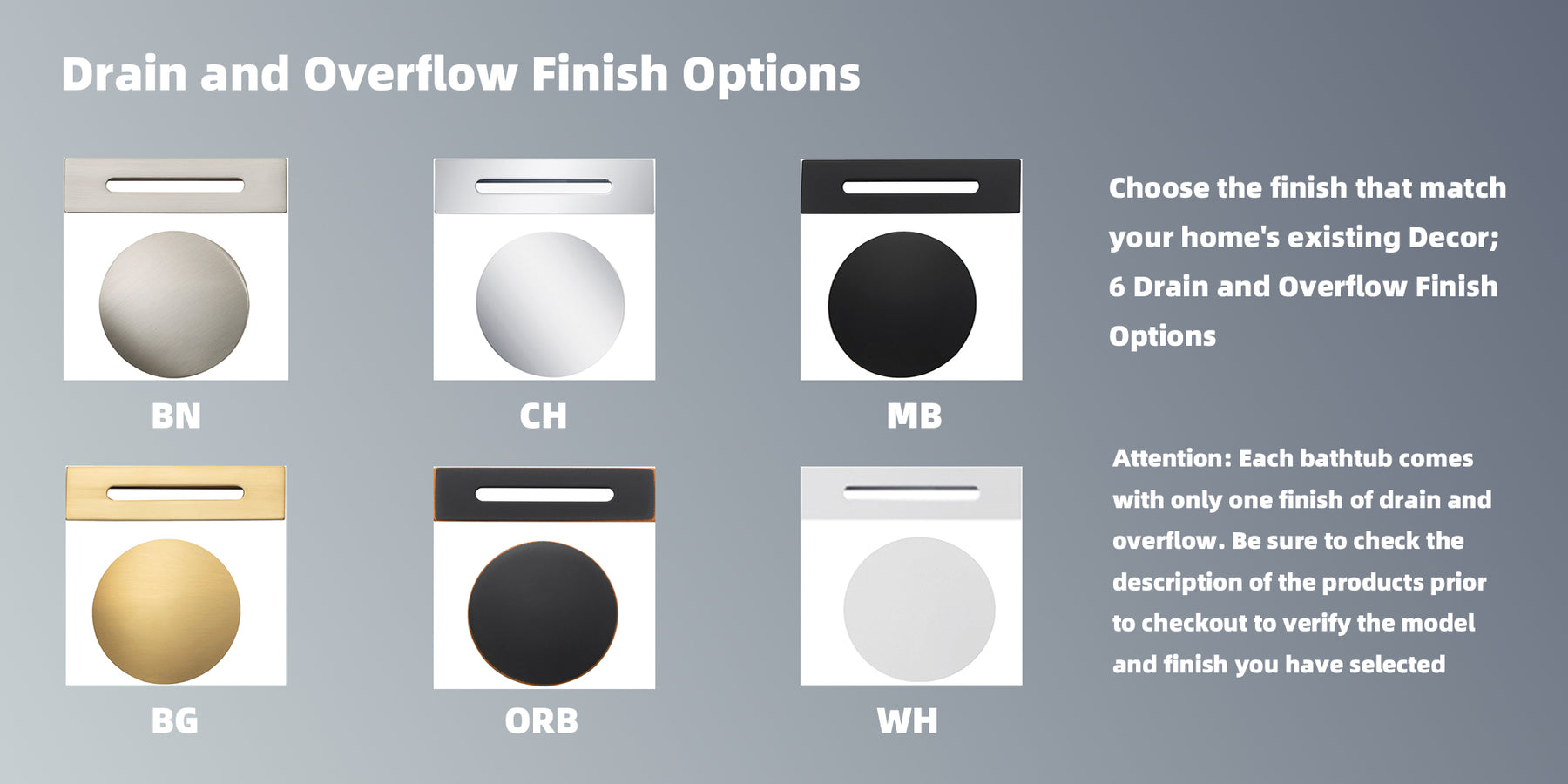 Finish Options BN, CH, MB, BG, ORB, WH (drain/overflow finishes)