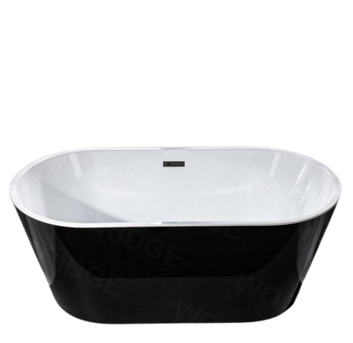 Compact yet luxurious, this 59-inch WOODBRIDGE acrylic freestanding bathtub features a double-ended, flat-bottom design with a matte black overflow and drain included. Made from high-gloss LUCITE acrylic reinforced with fiberglass, it offers durable performance and a comfortable soaking experience.