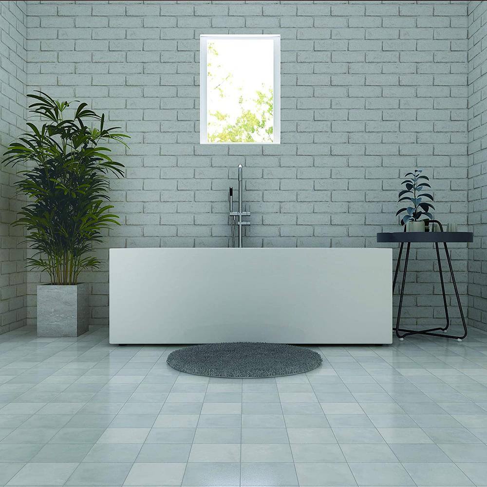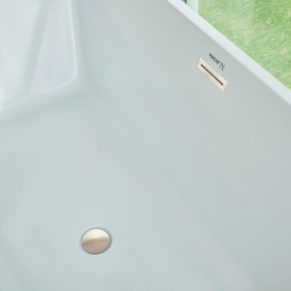 A crisp rectangular soaking tub crafted from durable acrylic with brushed nickel drain hardware. Its flat-bottom, self-leveling base and ergonomic backrest deliver spa-like comfort in a modern freestanding design.
