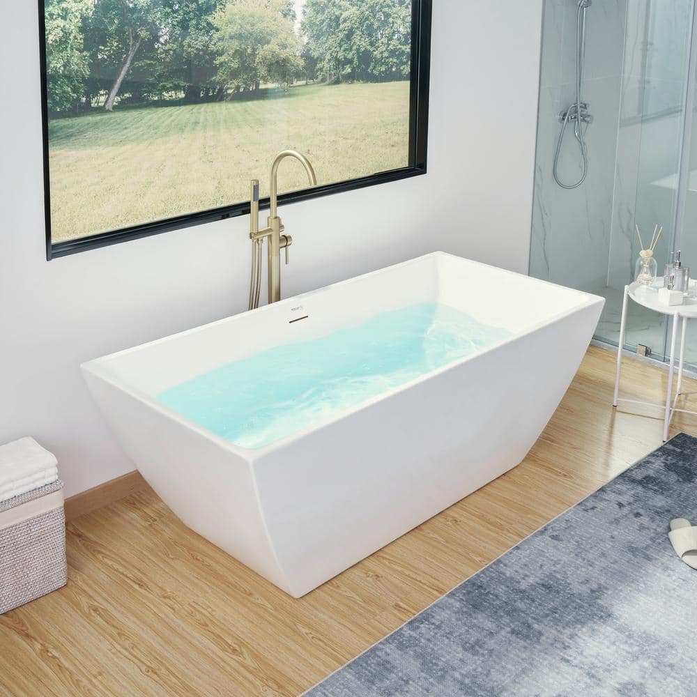 Sleek and spacious, this 67-inch freestanding soaking tub by Vanity Art is crafted from durable, high-gloss acrylic reinforced with fiberglass. The rectangular flat-bottom design with center drain and integrated overflow offers ergonomic comfort and easy cleaning for modern bathrooms.
