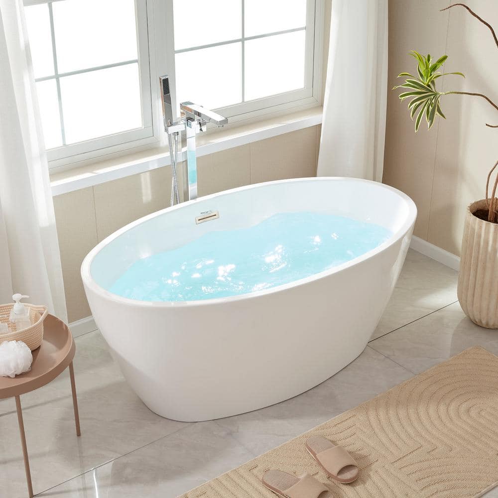 The Vanity Art Calais freestanding bathtub features a sleek oval silhouette in durable, high-gloss acrylic reinforced with fiberglass. A center drain with brushed nickel trim and ergonomic back support deliver a deep, relaxing soak in a compact 55-inch footprint.