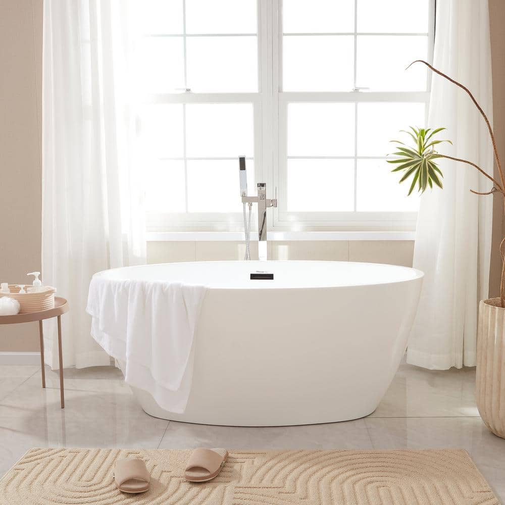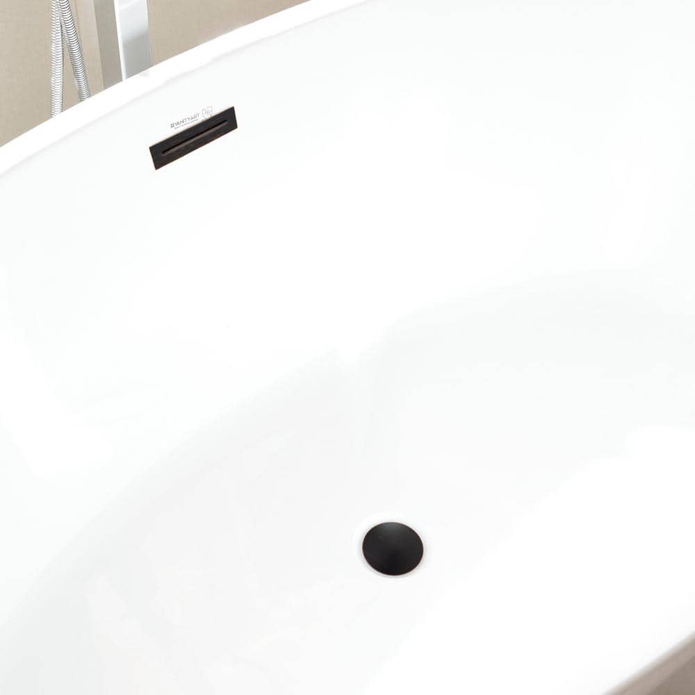 The Vanity Art Calais freestanding soaking tub pairs a sleek oval silhouette with durable, multi-layer reinforced acrylic for lasting beauty and easy maintenance. Its center drain and ergonomic design deliver spa-like comfort while the white finish with oil-rubbed bronze trim adds a modern touch.