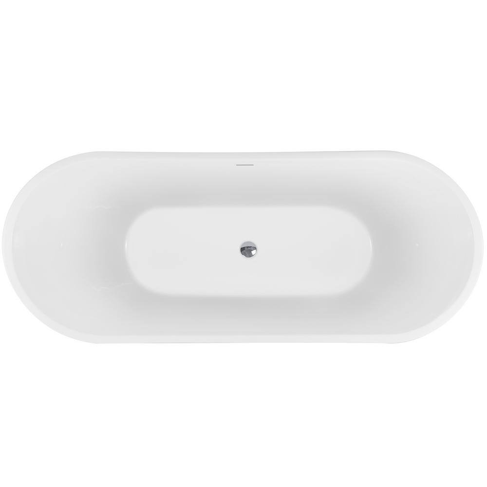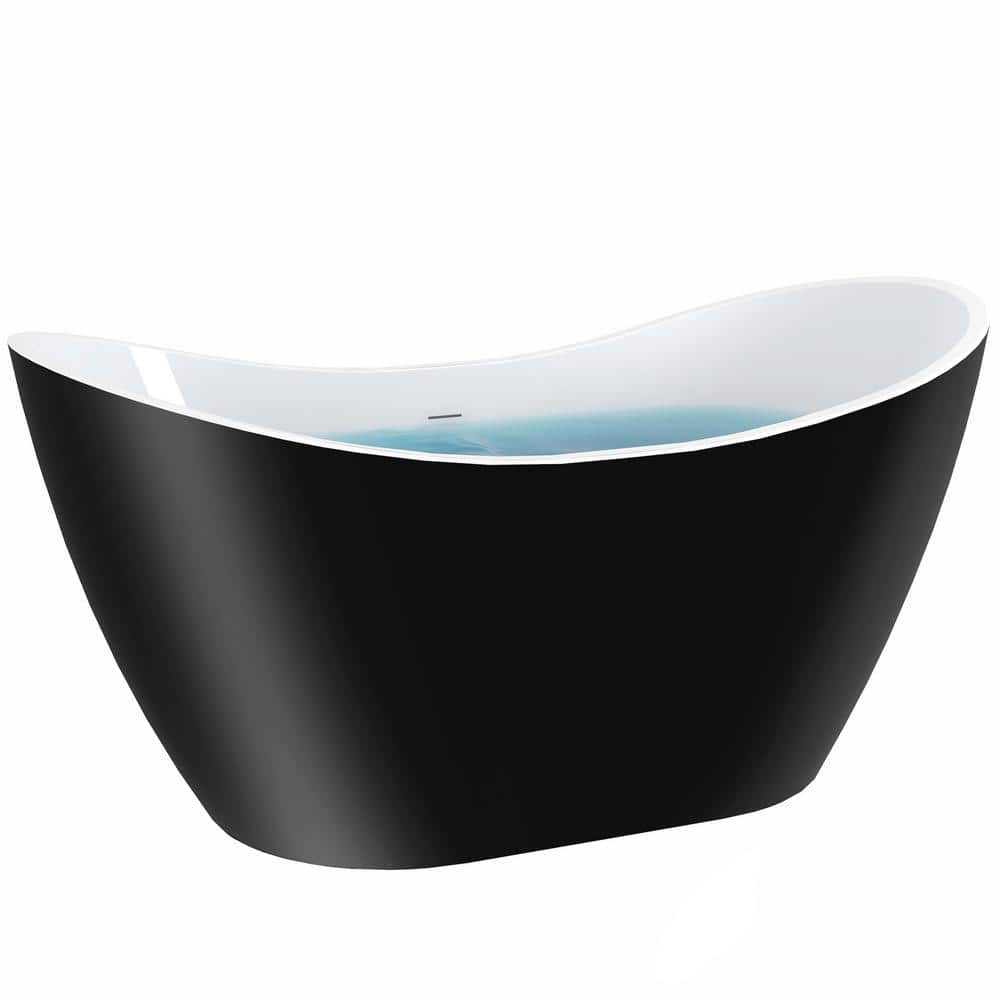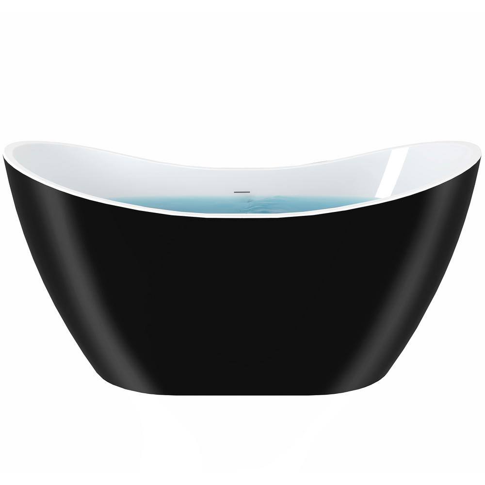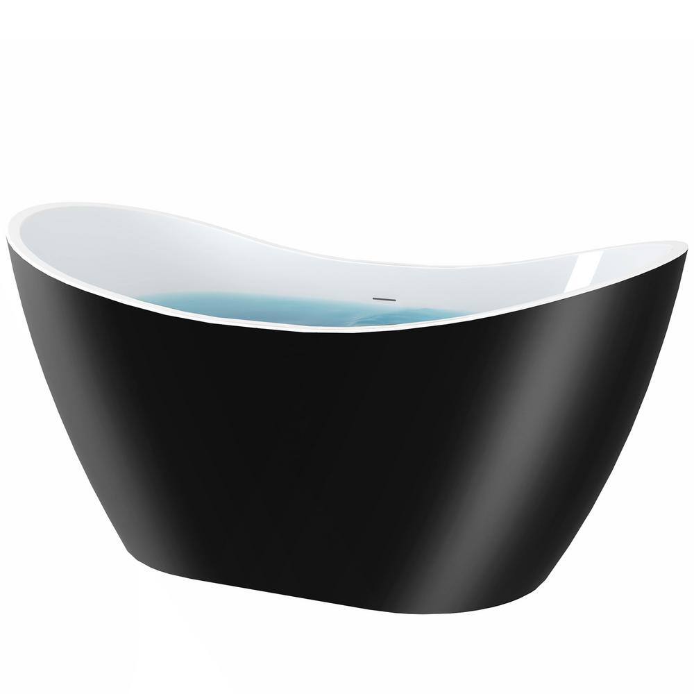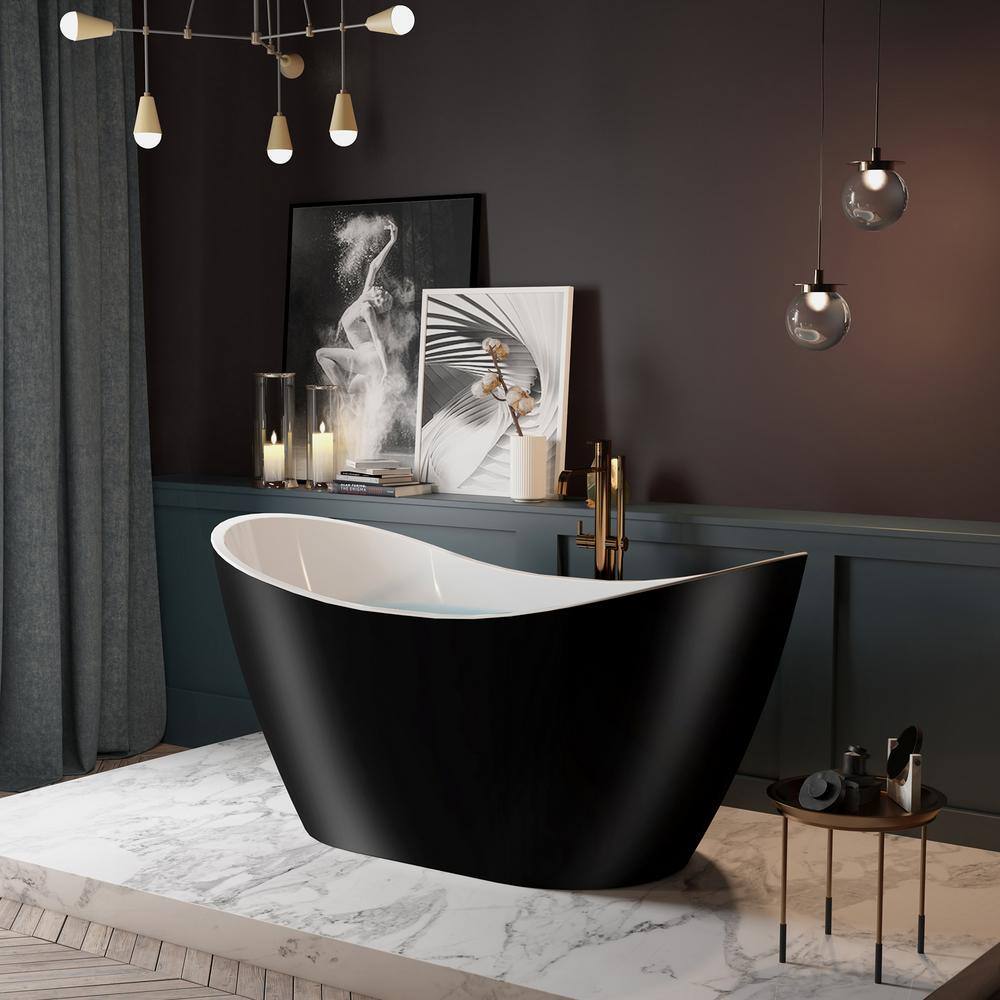 A modern freestanding soaking tub crafted from durable acrylic reinforced with fiberglass for long-lasting performance. Its double slipper silhouette with center drain offers ergonomic comfort and a striking matte-black exterior to elevate any bathroom. Includes pre-installed pop-up drain and overflow for easier setup.