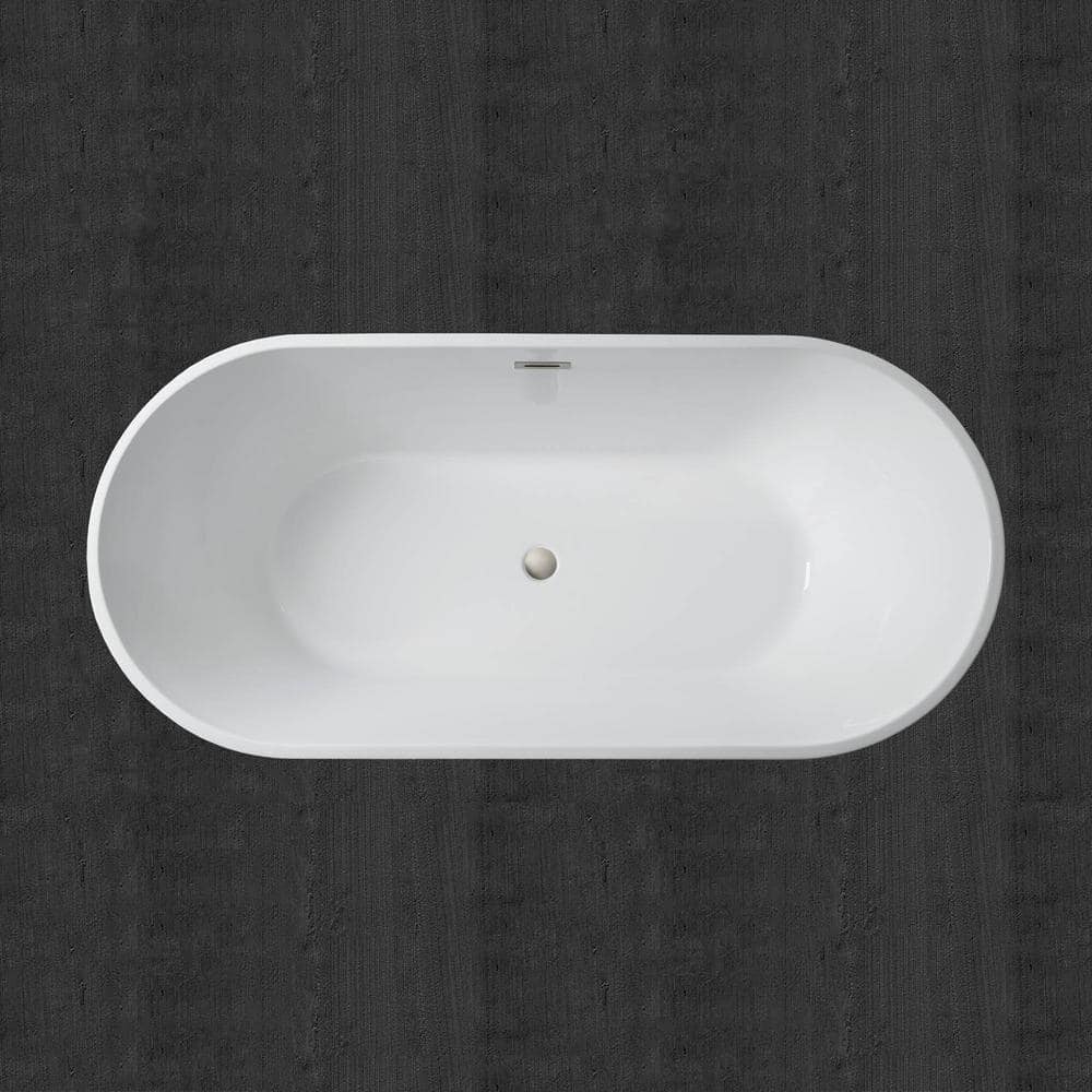 WOODBRIDGE Newark 59 in. Acrylic FlatBottom Double-Ended Freestanding Bathtub with Brushed Nickel Overflow and Drain, White
