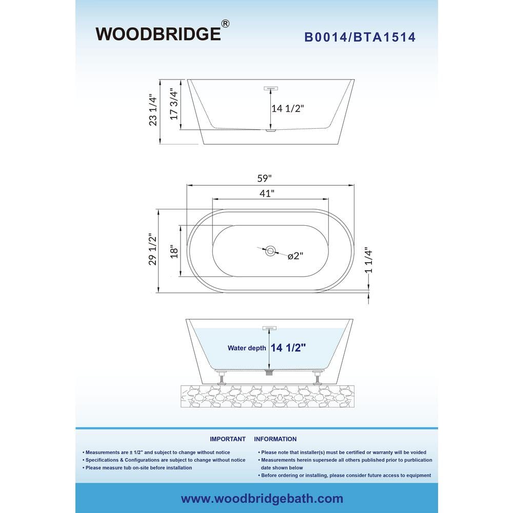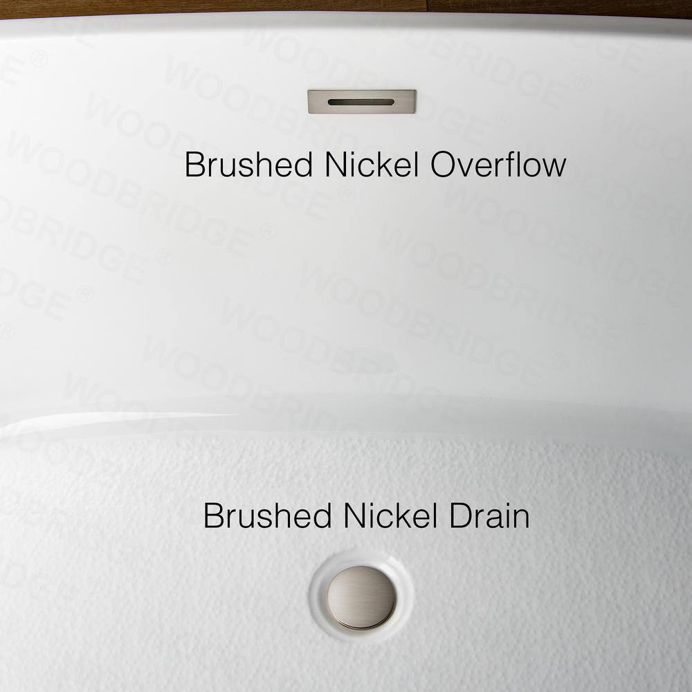 This WOODBRIDGE Newark 59-inch freestanding soaking tub pairs high‑gloss acrylic construction with fiberglass reinforcement for lasting durability and easy maintenance. A center drain with a fully integrated brushed nickel overflow delivers a clean look, while the non-slip textured bottom and self-leveling base enhance safety and installation.