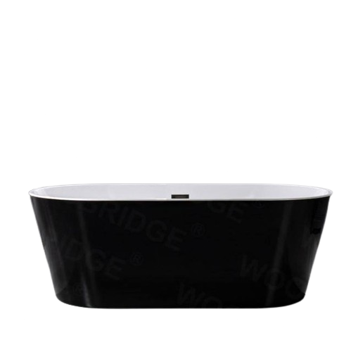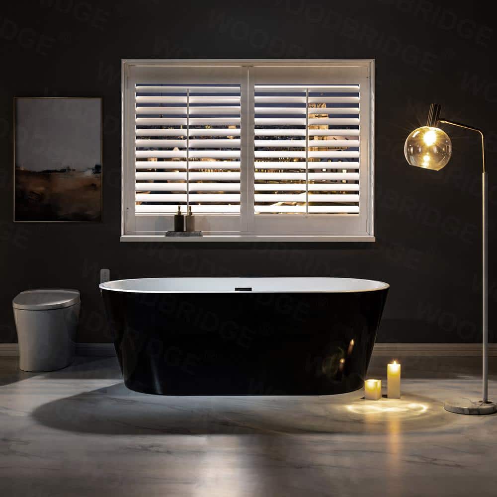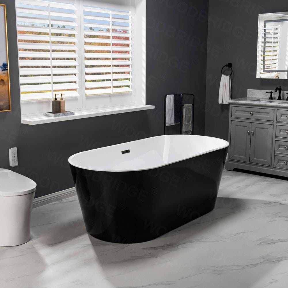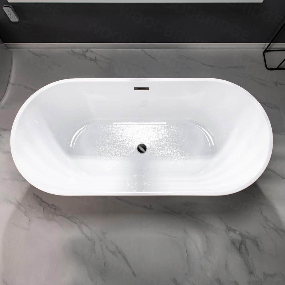 Sleek and comfortable, the WOODBRIDGE Piscataway 67 in. freestanding tub features a double-ended oval design in durable acrylic with fiberglass reinforcement. A sealed matte black overflow and drain are included, and the slip-resistant bottom adds safety for a relaxing soak.