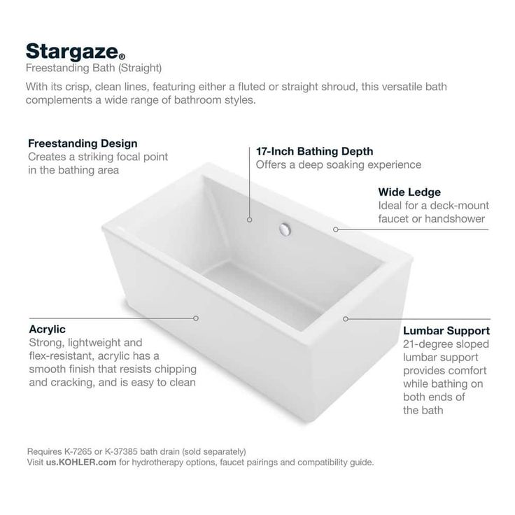 The KOHLER Stargaze bathtub is a freestanding soaking tub designed for comfort and style. With its ergonomic lumbar support and deep soaking depth, it offers a luxurious bathing experience. Made from durable acrylic, it features a sleek design that complements modern bathrooms.