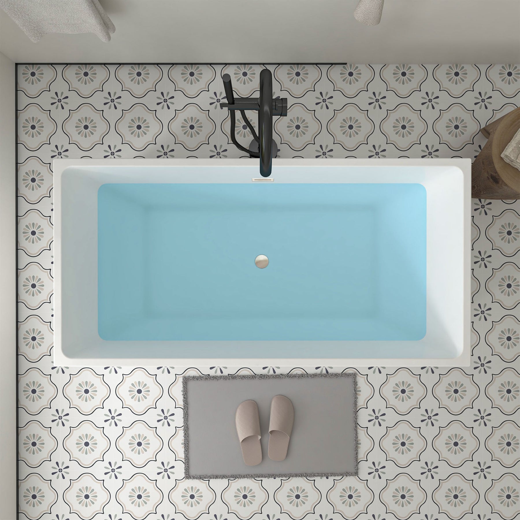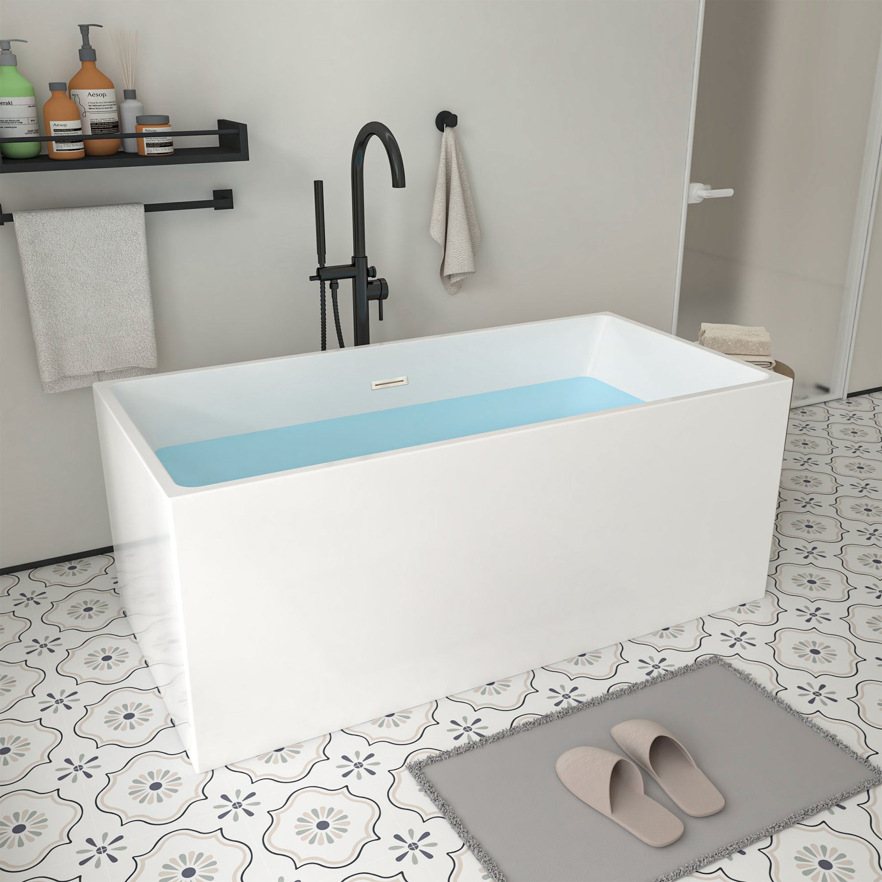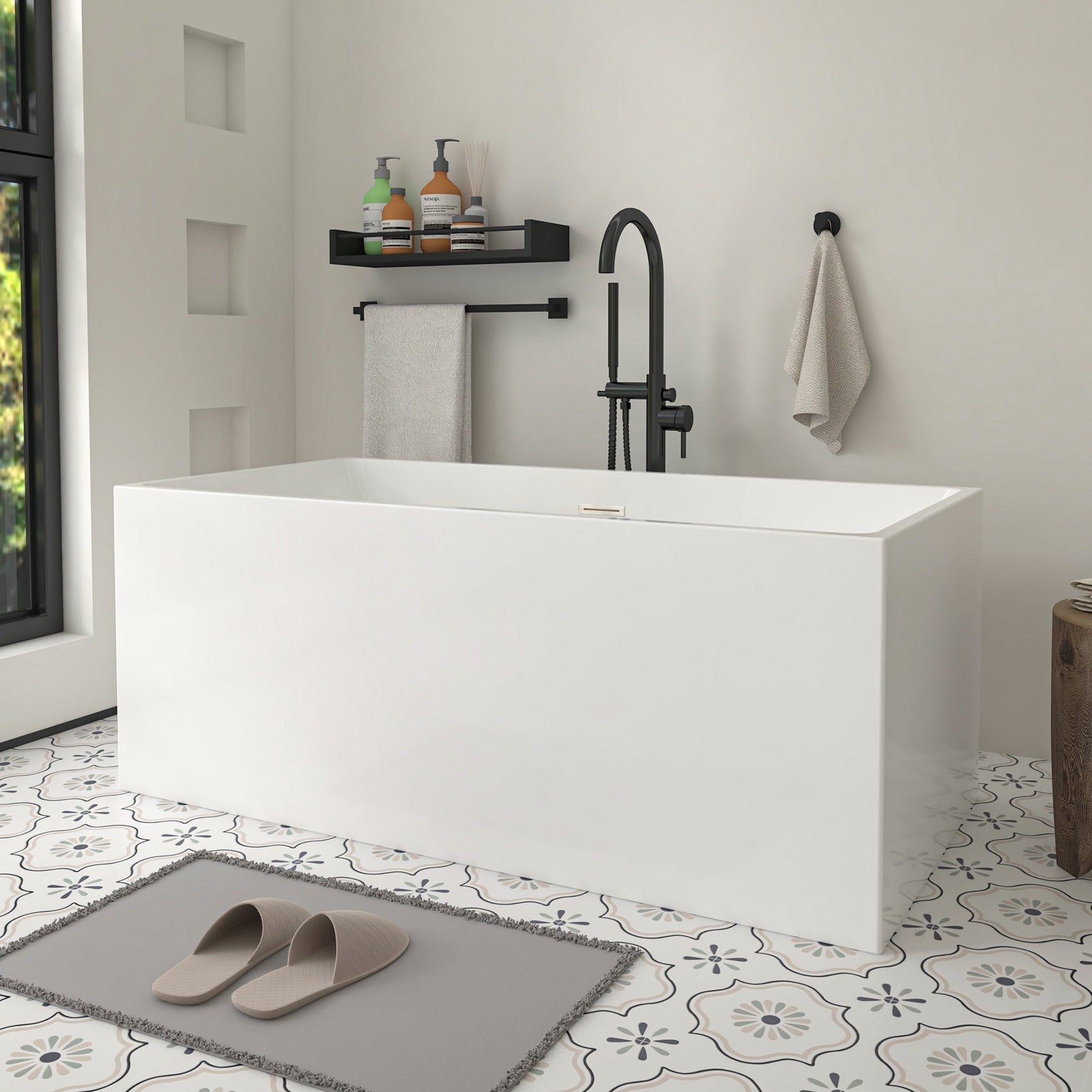 Sleek and spacious, the Talence 59-inch freestanding bathtub is crafted from 100% high-gloss acrylic for durability and easy maintenance. Its flat-bottom, ergonomic design offers deep soaking comfort with a reinforced base and a non-porous, stain- and scratch-resistant surface.