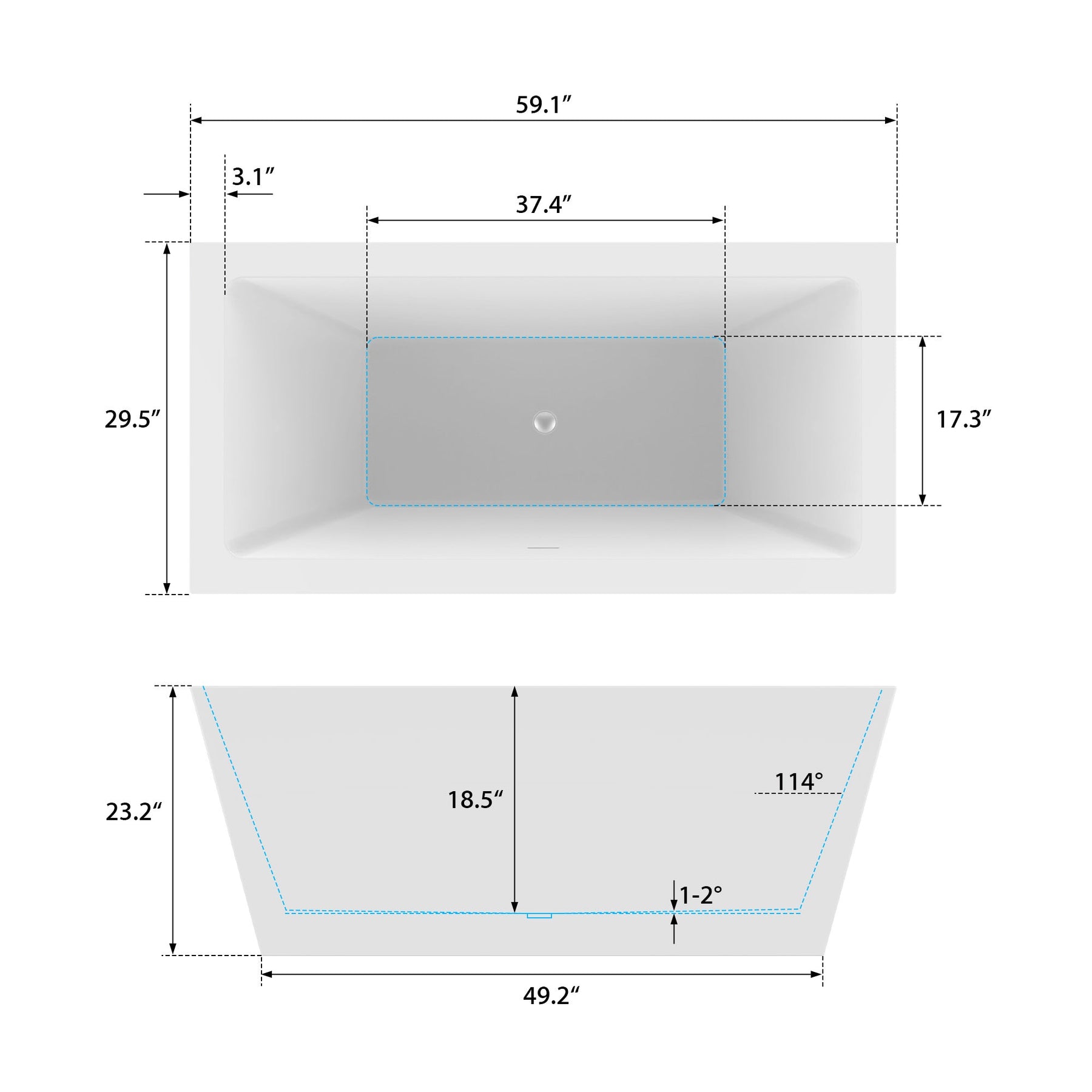 Basin Length (59 in model image) 37.4 in (interior)
