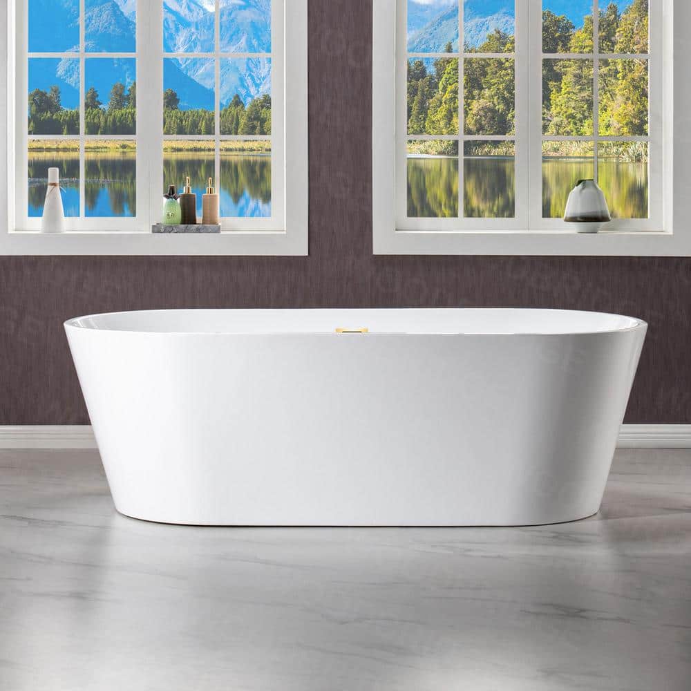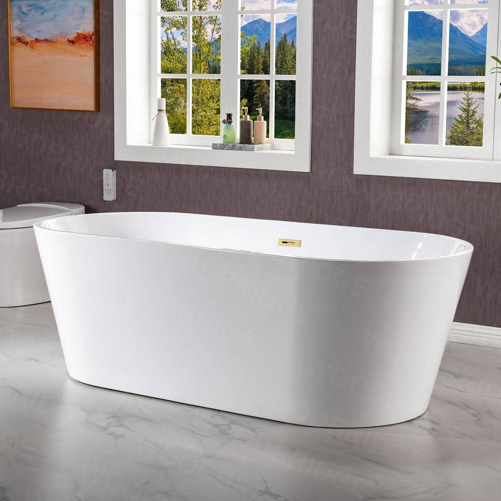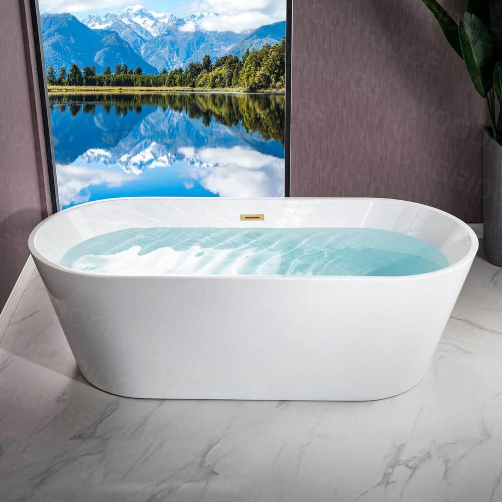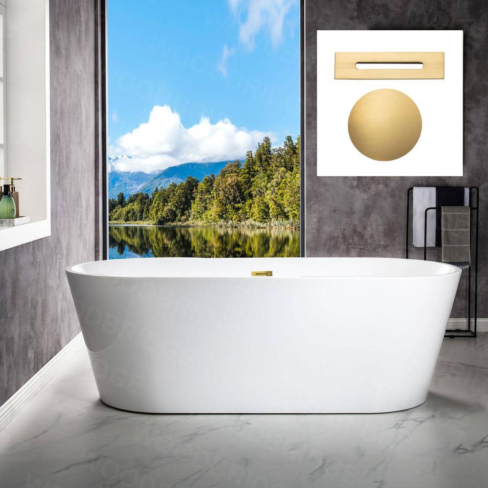 This freestanding silhouette brings a calm, modern elegance to the bath, its gentle oval profile echoing organic forms. The brushed gold trim is a refined accent—quietly glamorous against the luminous white acrylic. Style it with a floor-mounted filler and soft, layered towels to let the architecture sing. A luxurious essential that transforms daily rituals into a spa-level experience.
