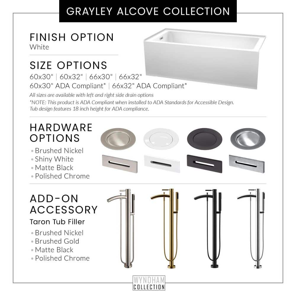 The Wyndham Collection Grayley Alcove Bathtub offers a modern, space-saving design with a durable acrylic construction. Featuring a left-hand drain, polished chrome trim, and a comfortable soaking depth, this tub is perfect for any bathroom renovation.