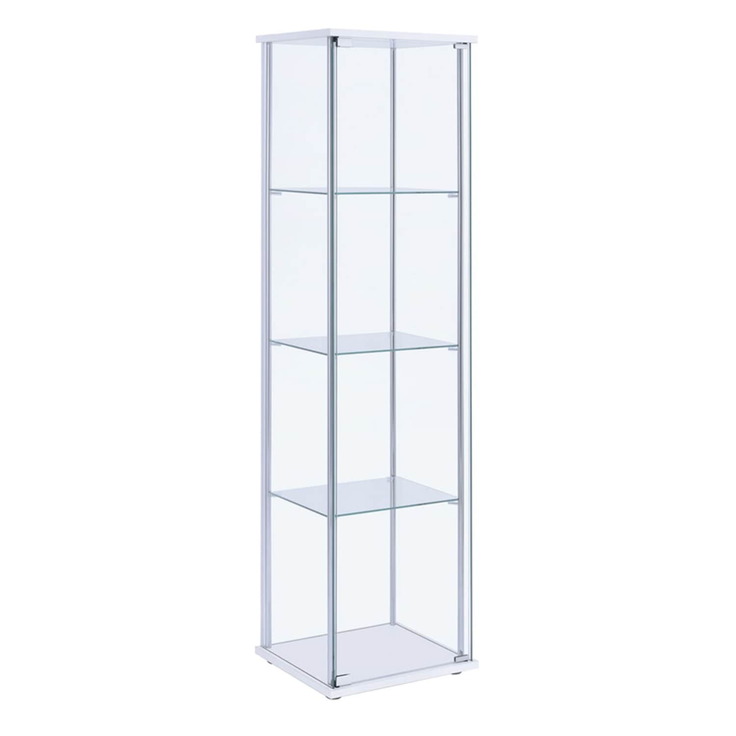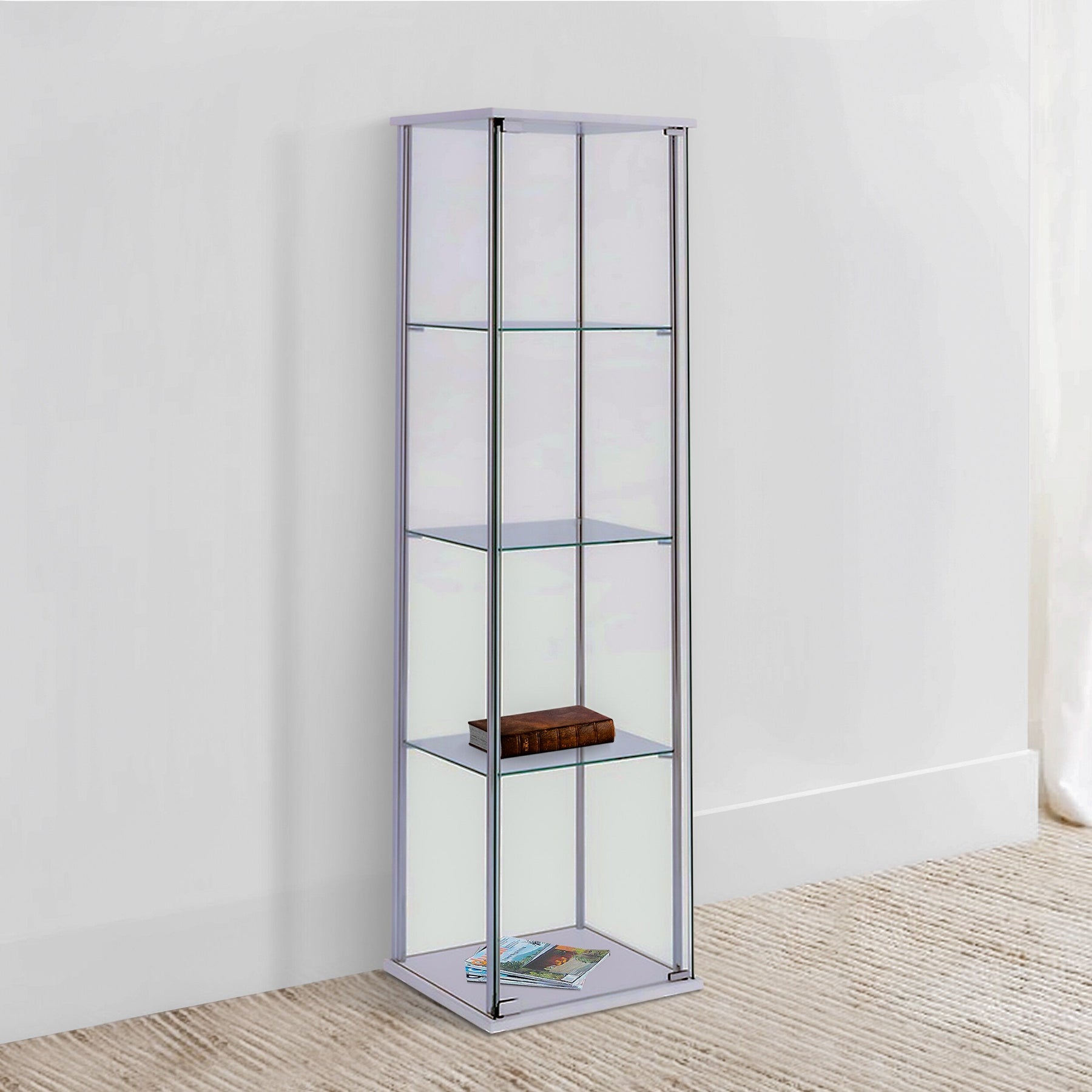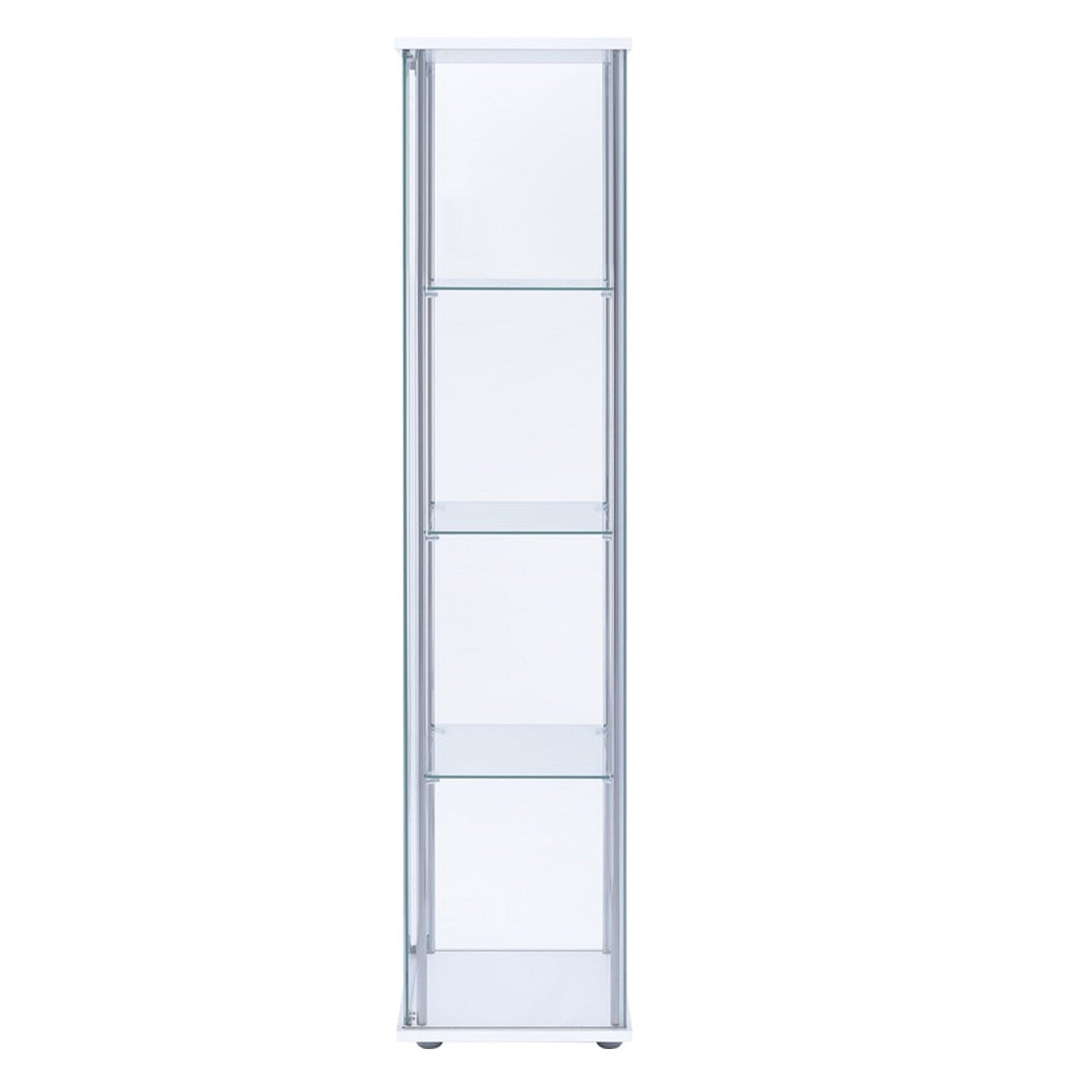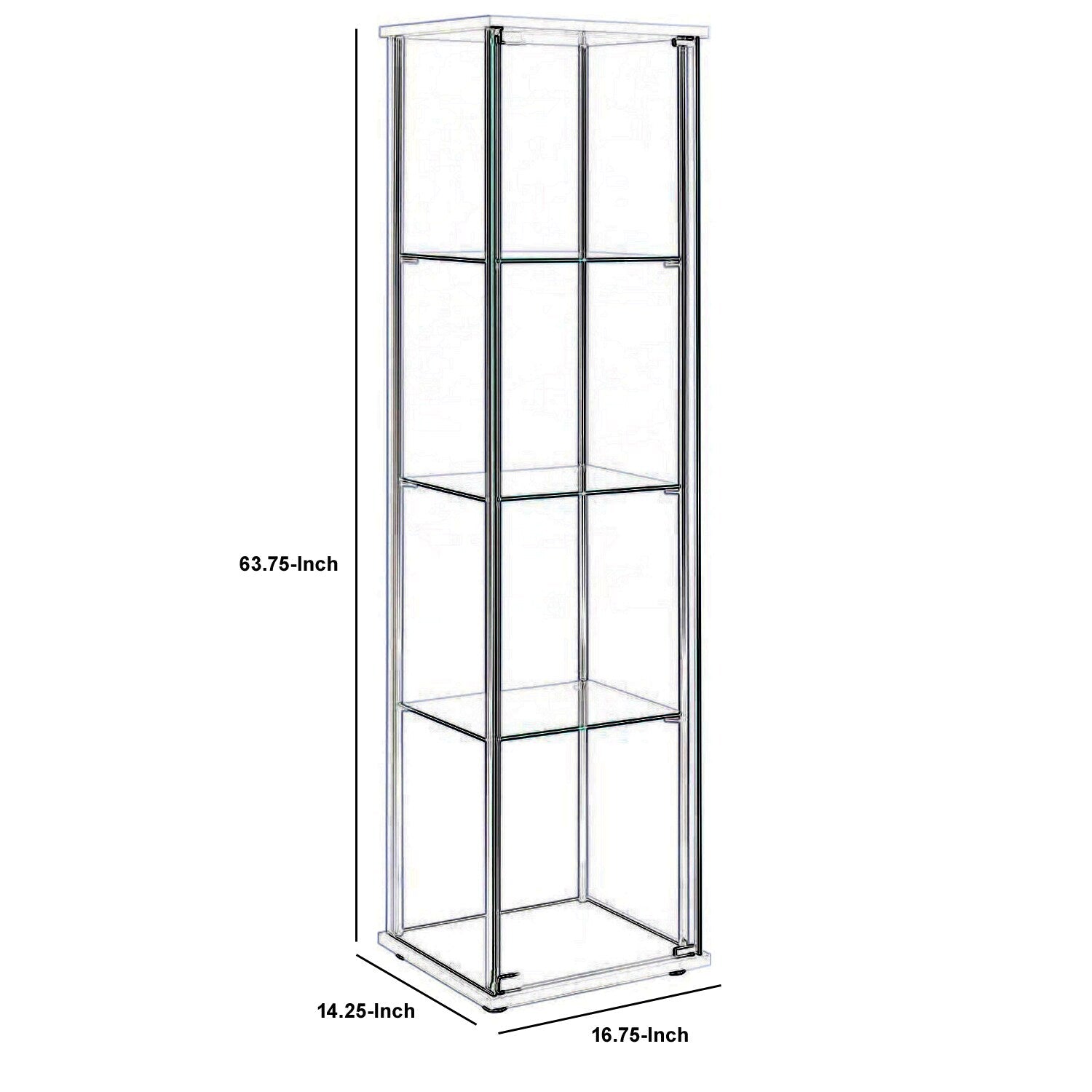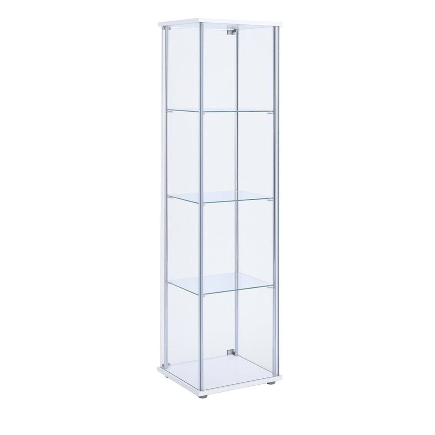 This contemporary clear and white metal curio cabinet combines modern elegance with functionality, offering four spacious glass shelves to beautifully display your cherished items. Crafted from durable metal and clear glass, it enhances your space with a sleek, airy look that complements any decor setting.