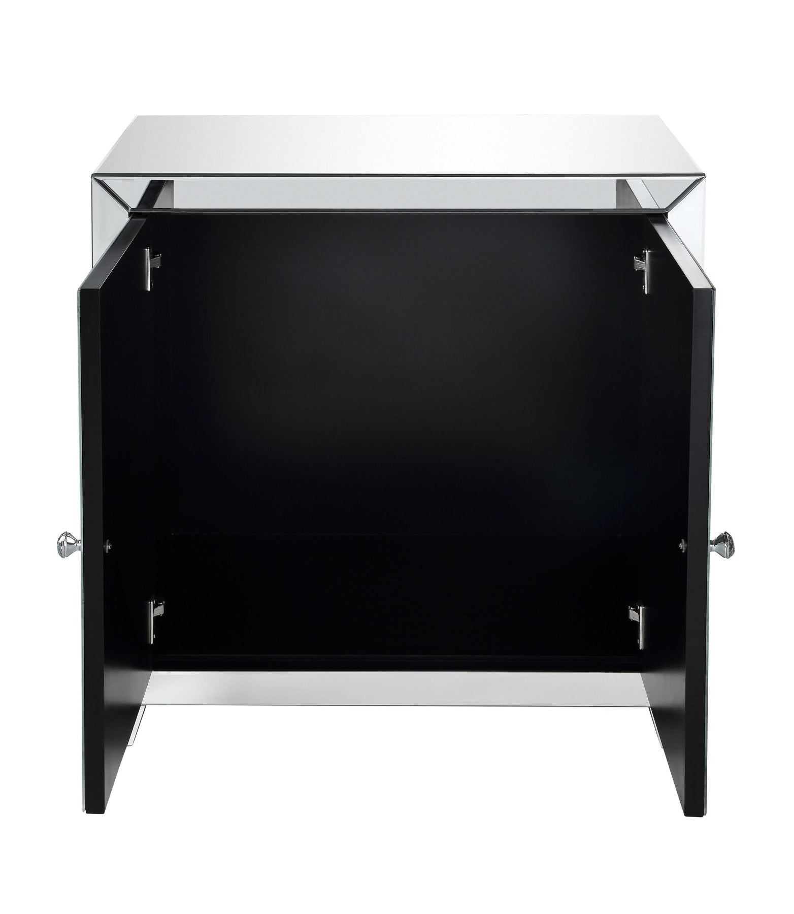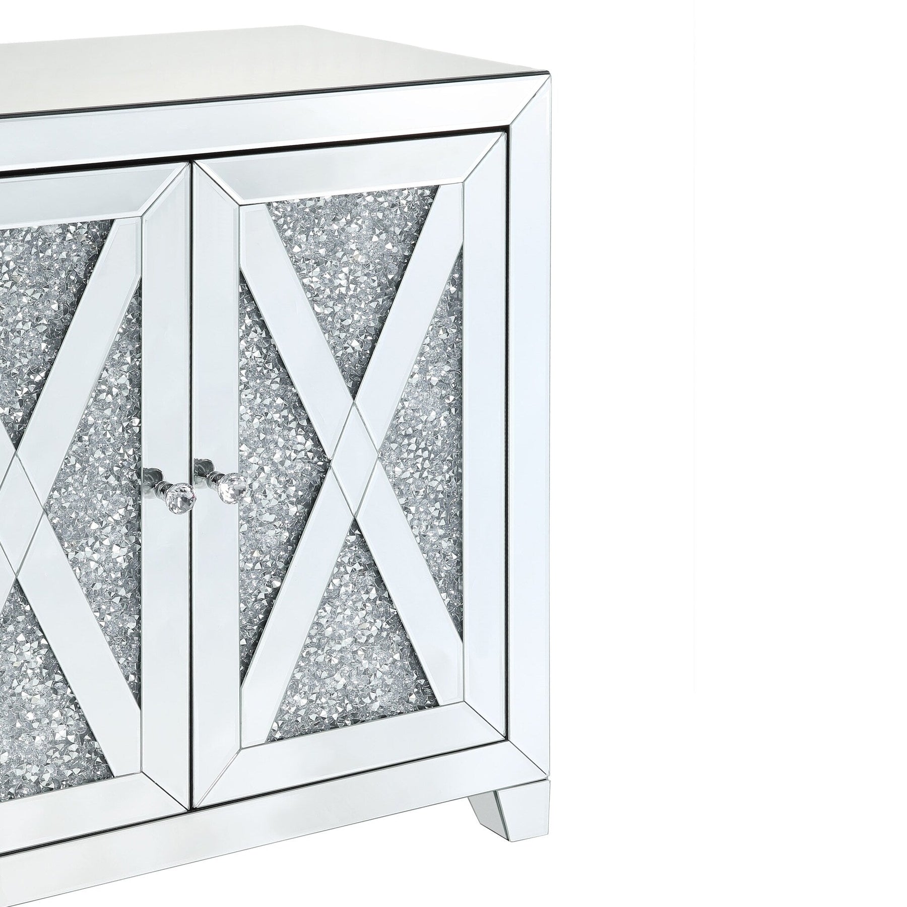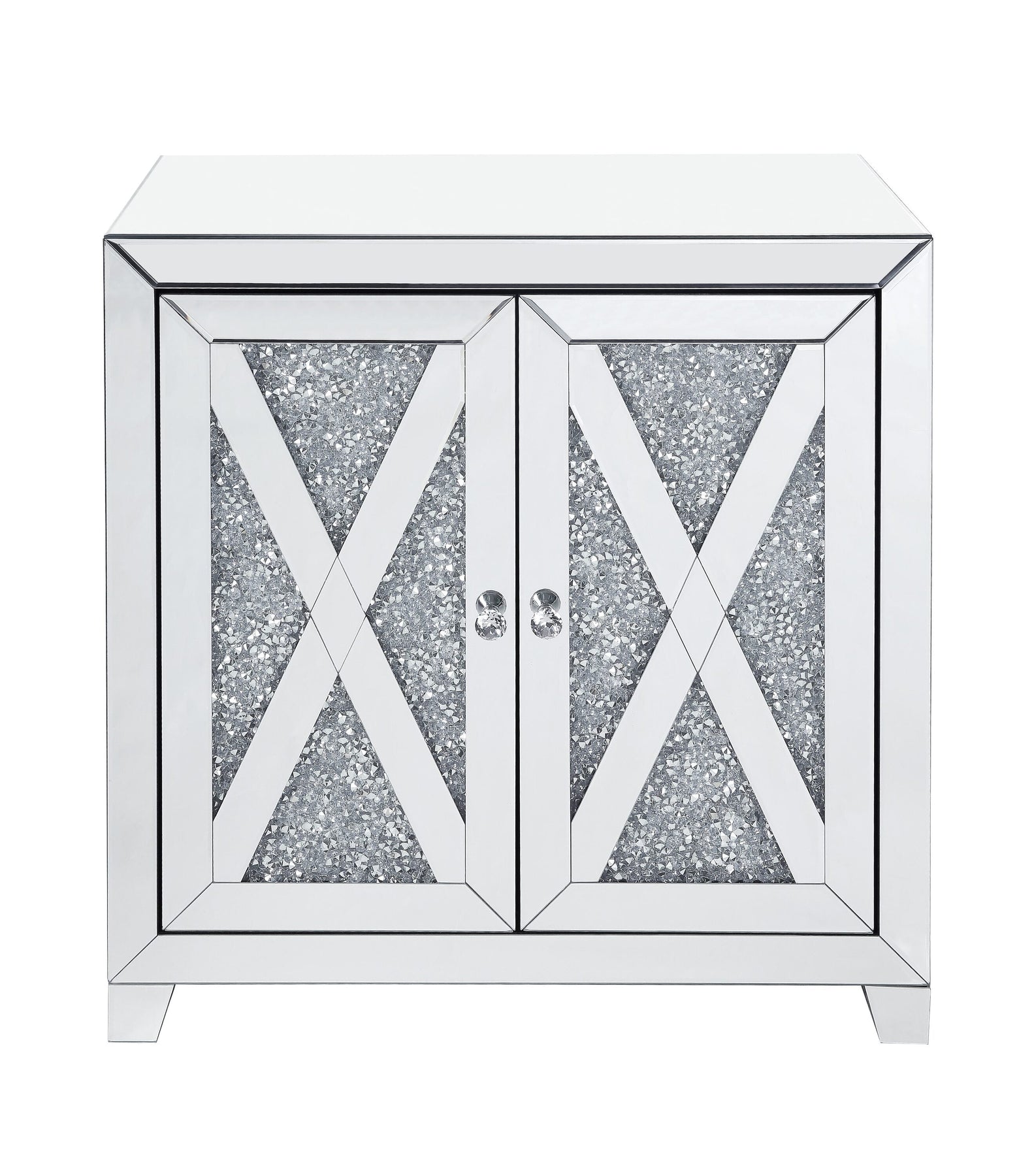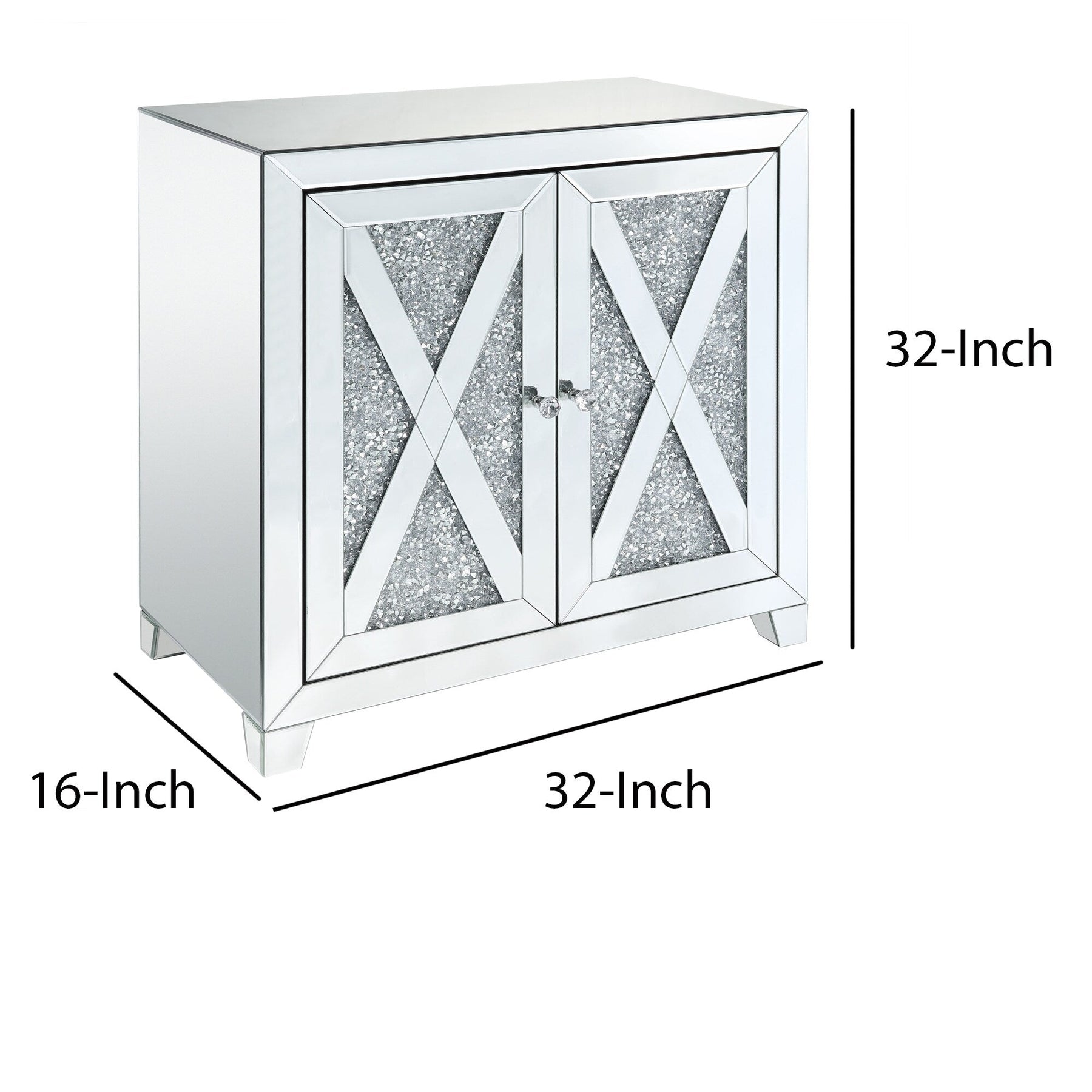 This Benzara Silver Storage Chest is a striking piece that combines contemporary style with functional storage. With its mirrored trim and faux diamond inlays, it elevates any space while providing ample hidden storage behind two beautifully designed doors.