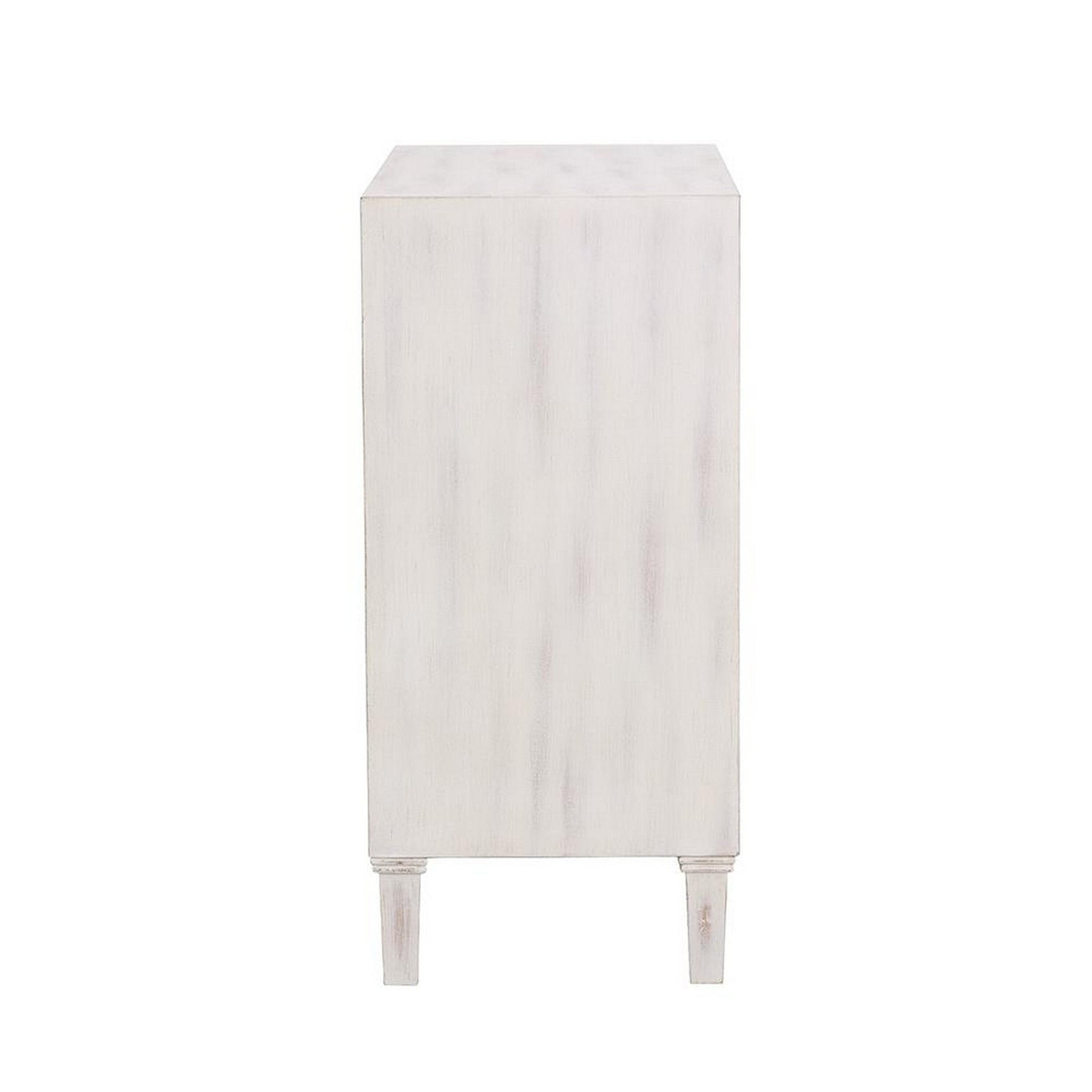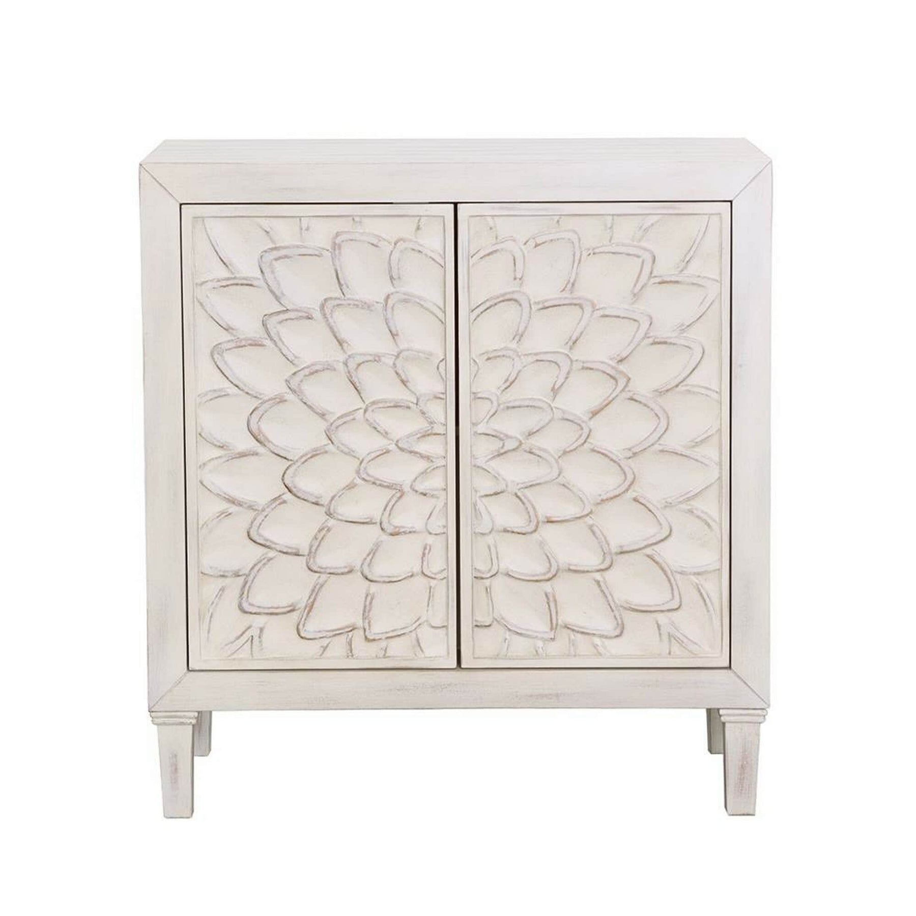 Elevate your living space with the Benzara Whitewash Accent Chest, a blend of artistic flair and rustic charm. This accent cabinet showcases an intricate floral carving and a distressed finish, offering both beauty and functionality with its ample storage space behind two doors. Ideal for modern interiors seeking a touch of craftsmanship and elegance.