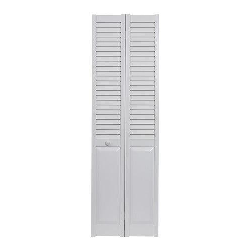 Seabrooke bifold door including top track and installation hardware Classic louver over panel white PVC vinyl bifold door Ready to install, heavy duty track, knob and installation hardware PVC vinyl construction Cleans easily For interior applications only Raised panel on front side only