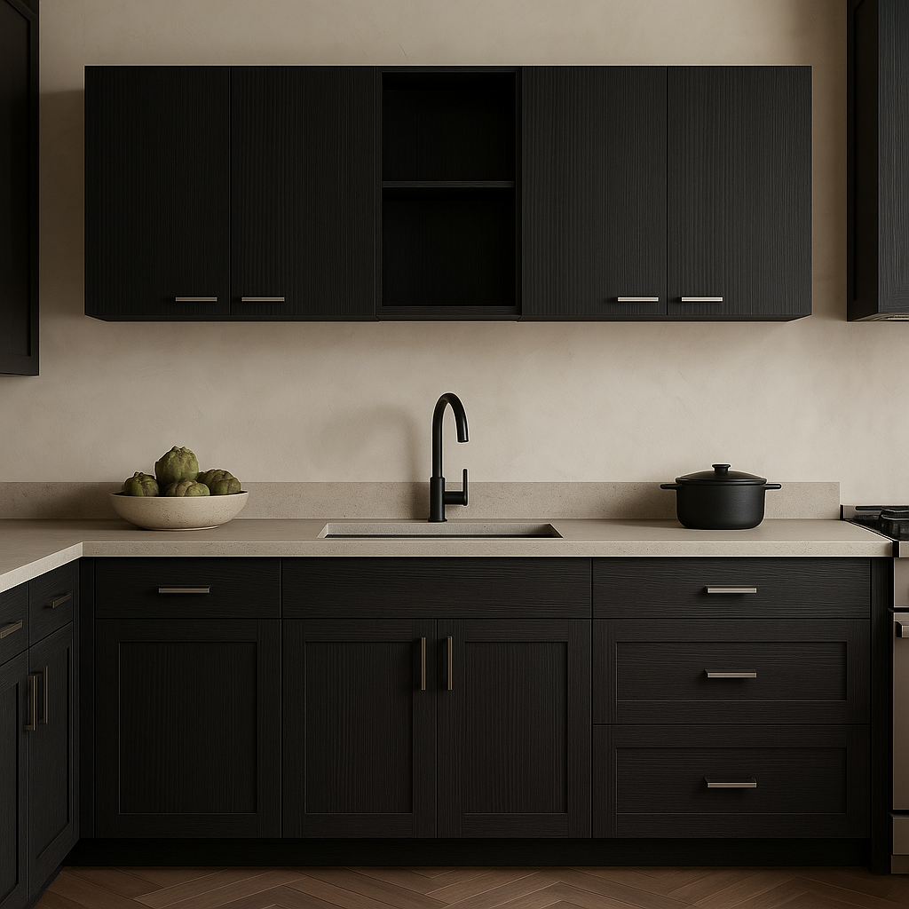 This sleek black wall-mounted cabinet transforms your kitchen into a haven of style and functionality. Its modern design, complemented by metal handles, adds a touch of sophistication to any space. The built-in dish rack and open shelves offer practical storage while showcasing your favorite kitchen accessories. Pair it with matching pieces for a cohesive and luxurious kitchen aesthetic.