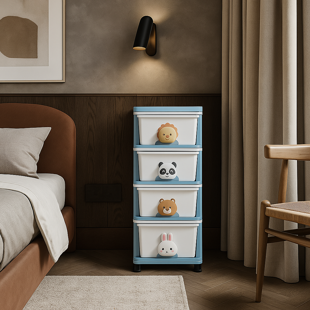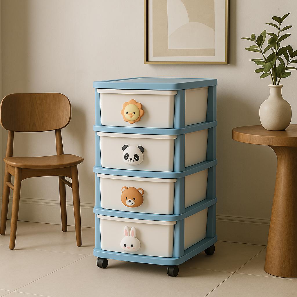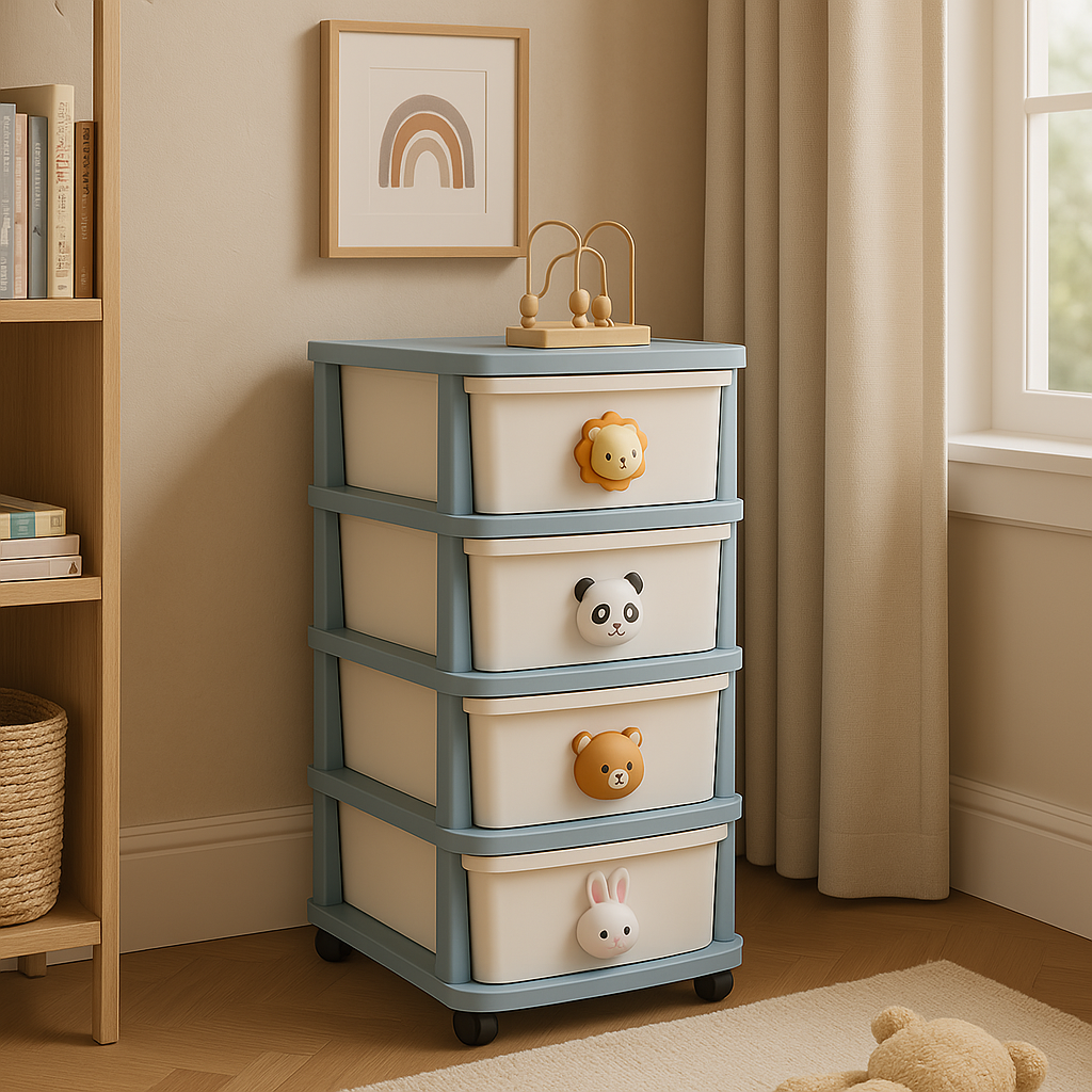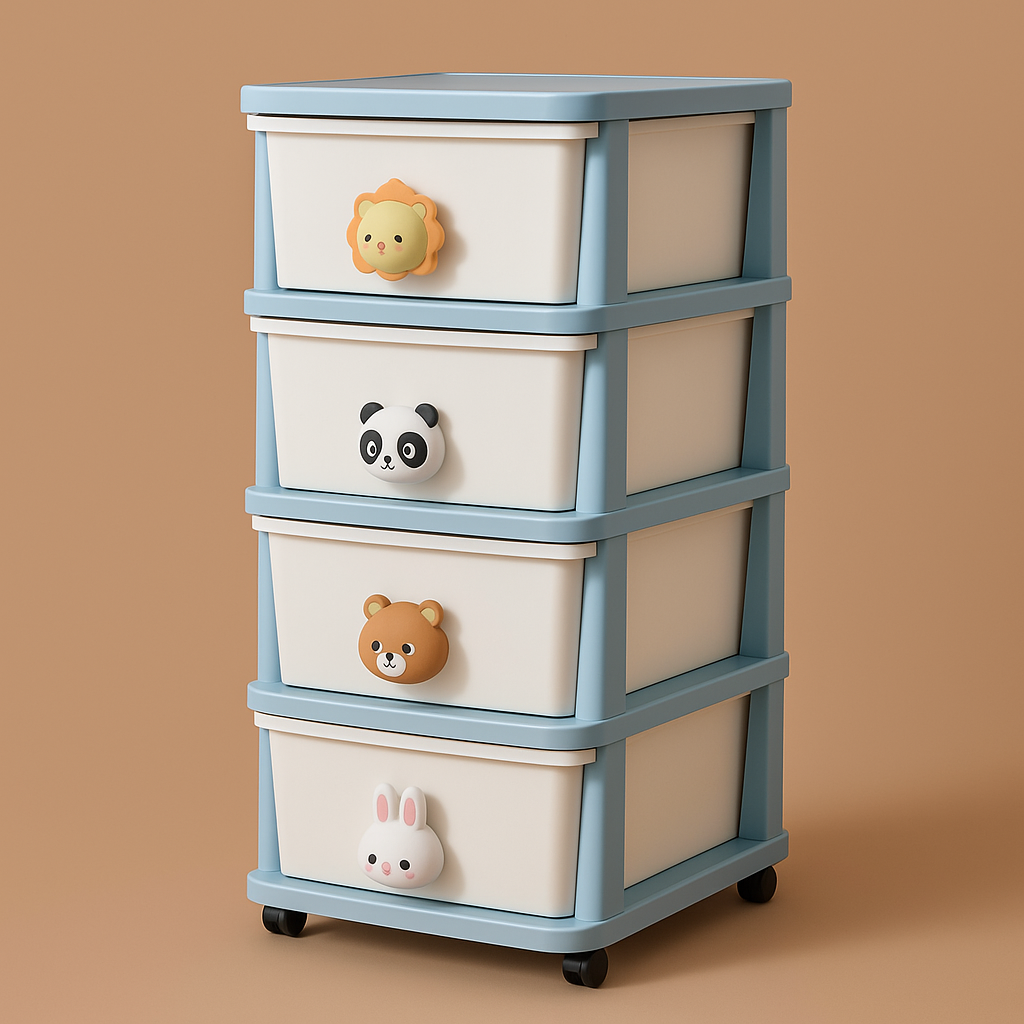 The FUNKOL 4-layer storage cabinet combines functionality and style with its eco-friendly PP material, cartoon handles, and smooth wheels. Perfect for organizing items in any room, it offers durability, easy assembly, and a charming design.