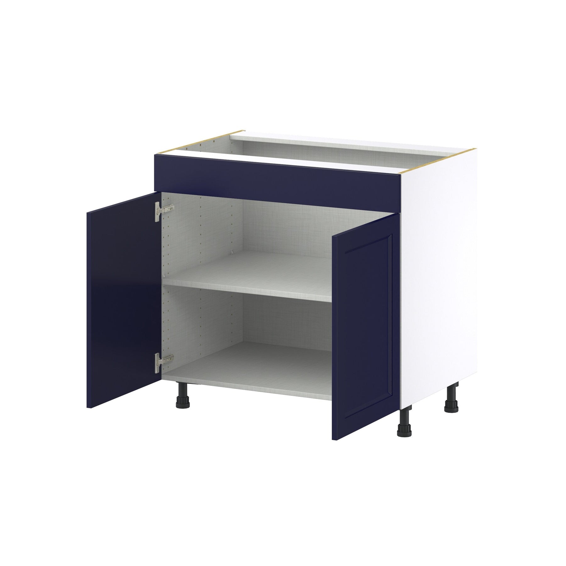 The Hugo&Borg Lorette 36" Navy Blue Base Cabinet offers a stylish and practical answer for any kitchen design. Featuring an elegant recessed panel shaker style, this cabinet is fully assembled for convenience and grants up to 20% more storage with its full access box construction. Its high-quality, stain-resistant navy blue finish promises long-lasting beauty and functionality.