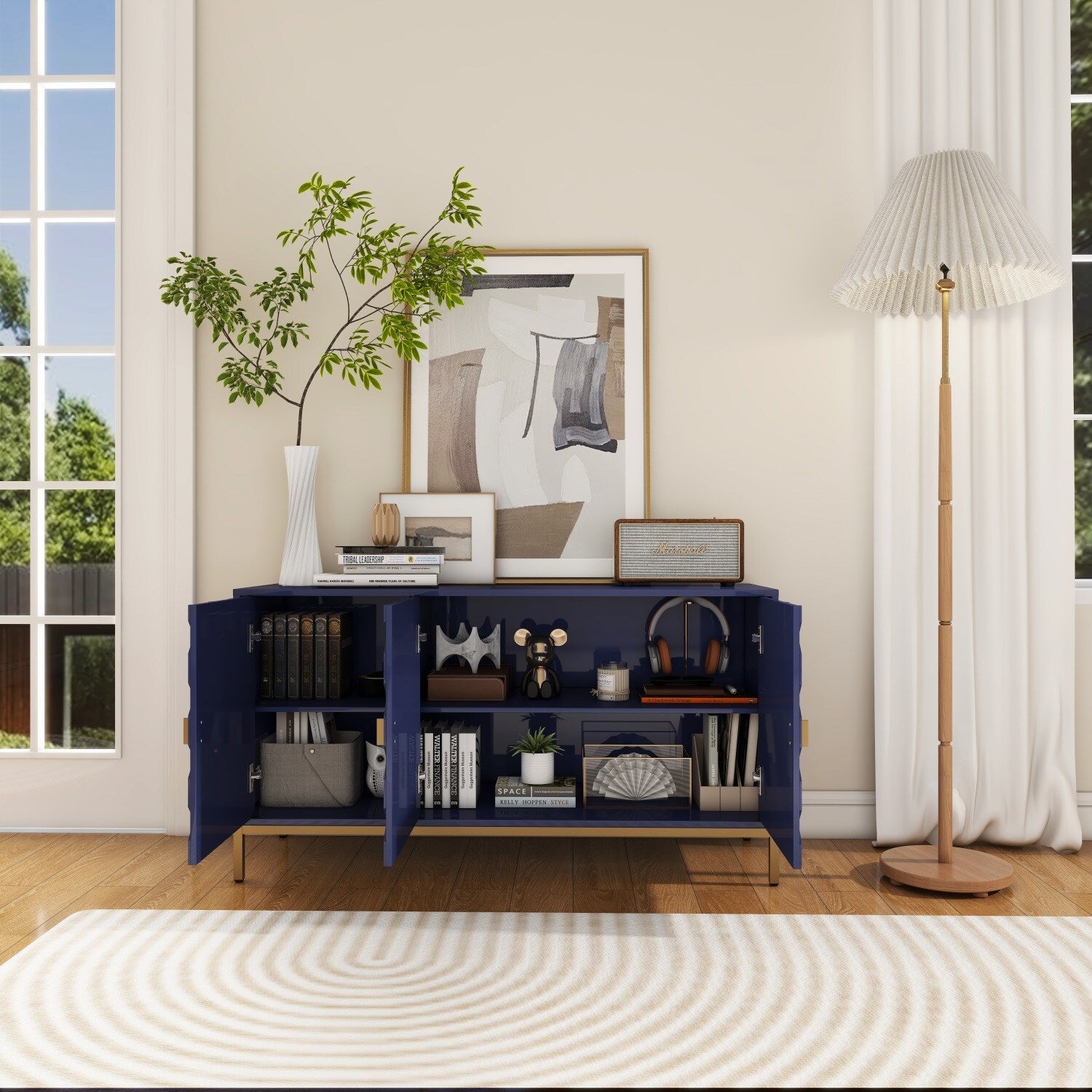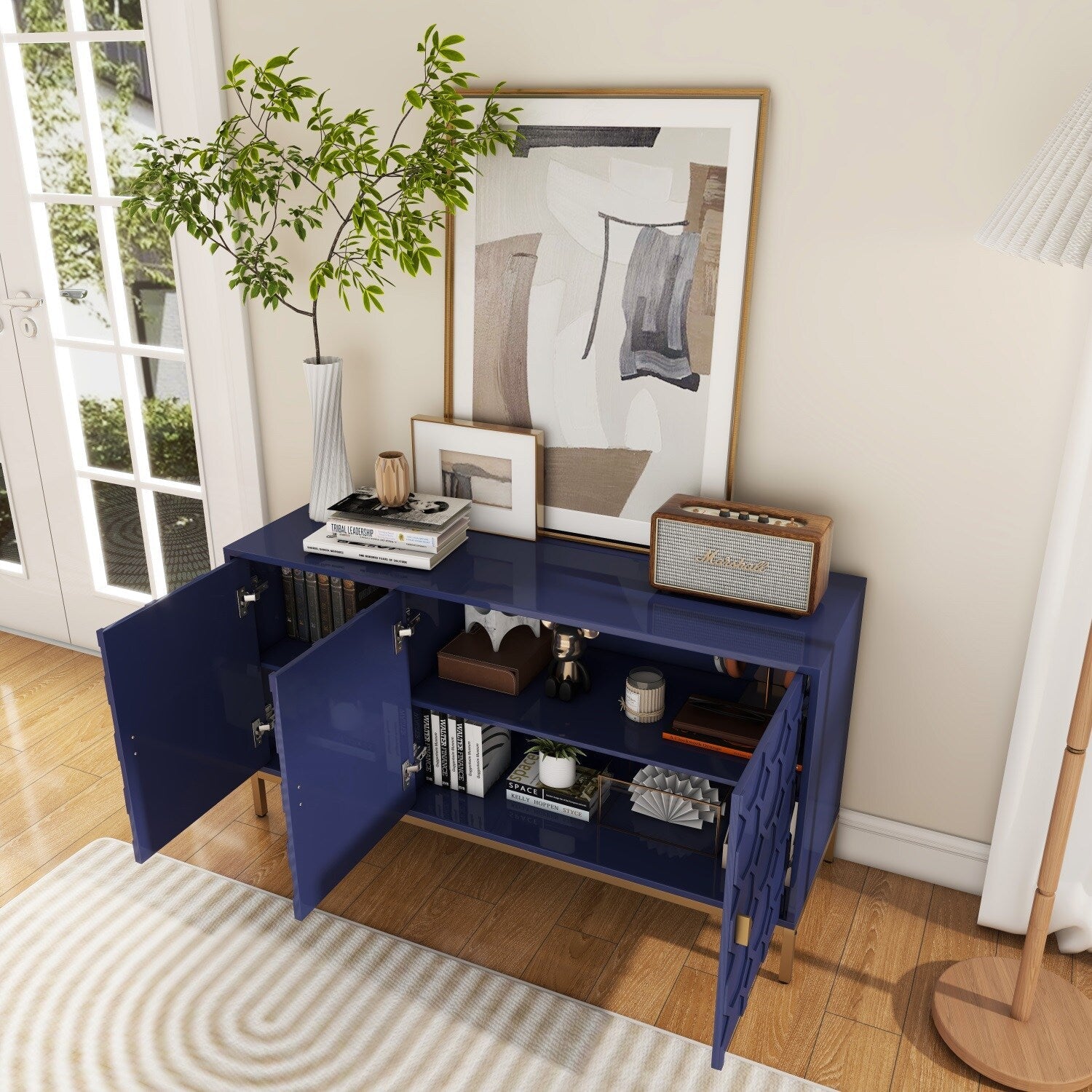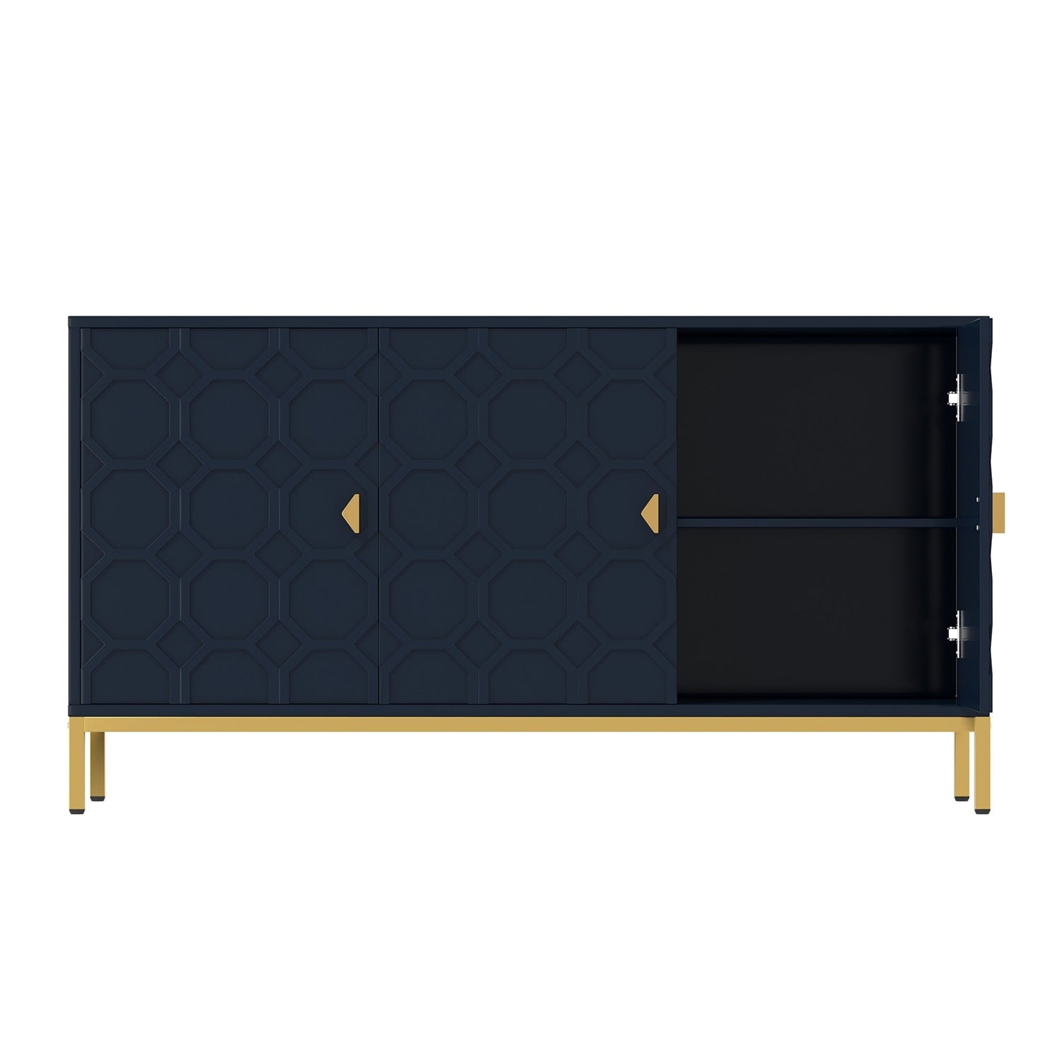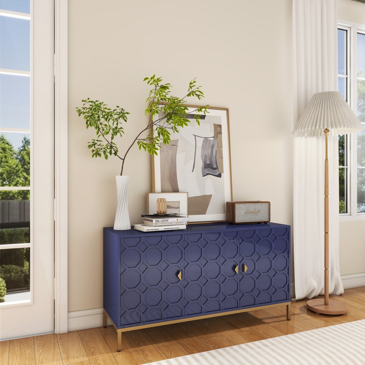 Transform your interior with the Mondawe Accent Cabinet—a stunning blend of practical design and visual elegance. The vibrant blue finish and honeycomb-patterned doors stand out as an artful centerpiece in any room. It elegantly balances form and function, perfect for showcasing curated decor or storing life’s essentials with style. Elevate your living space and enjoy a touch of modern luxury that complements your lifestyle.