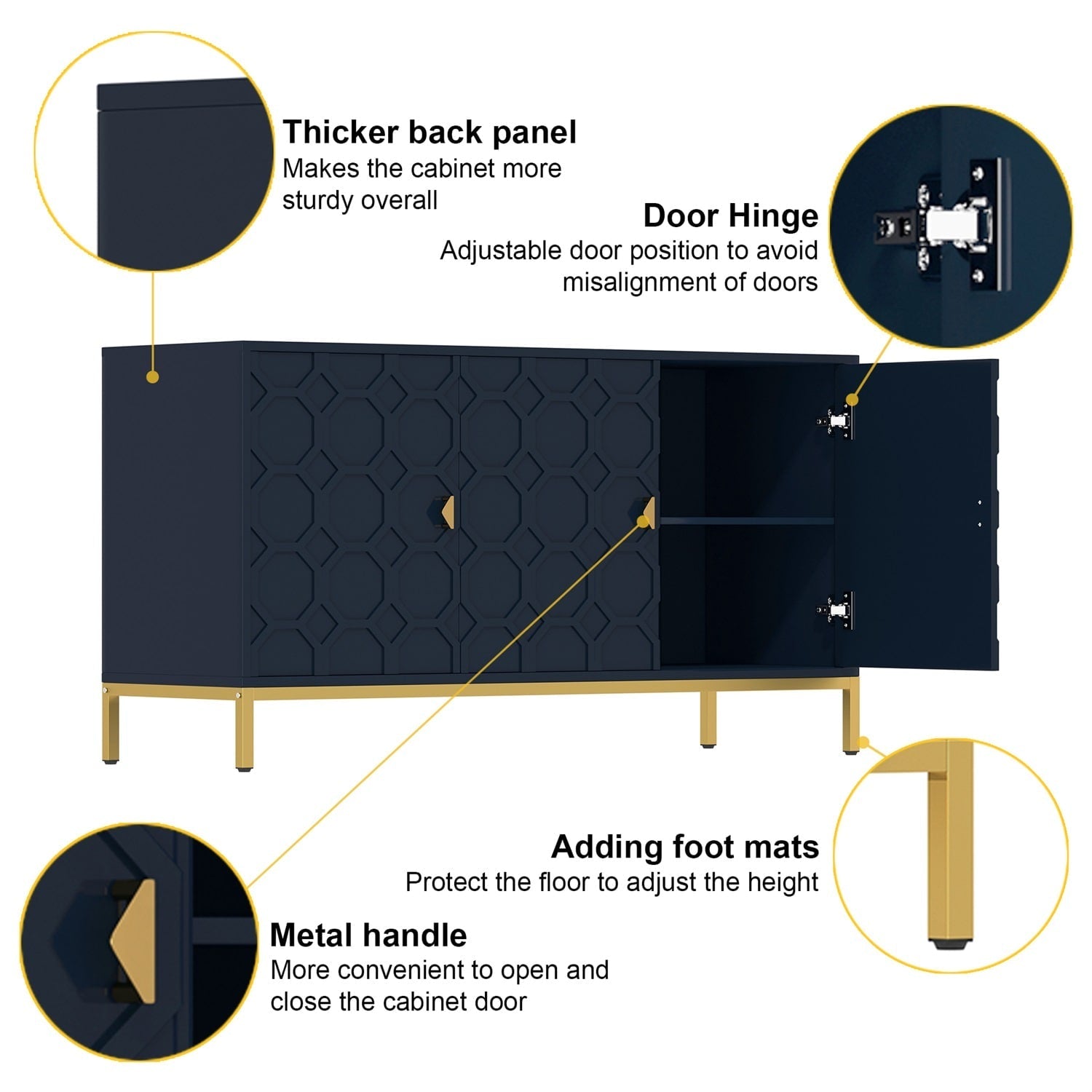 A: The cabinet features adjustable hinges; you can fine-tune the door height, depth, and gap using the provided screws for precise alignment.