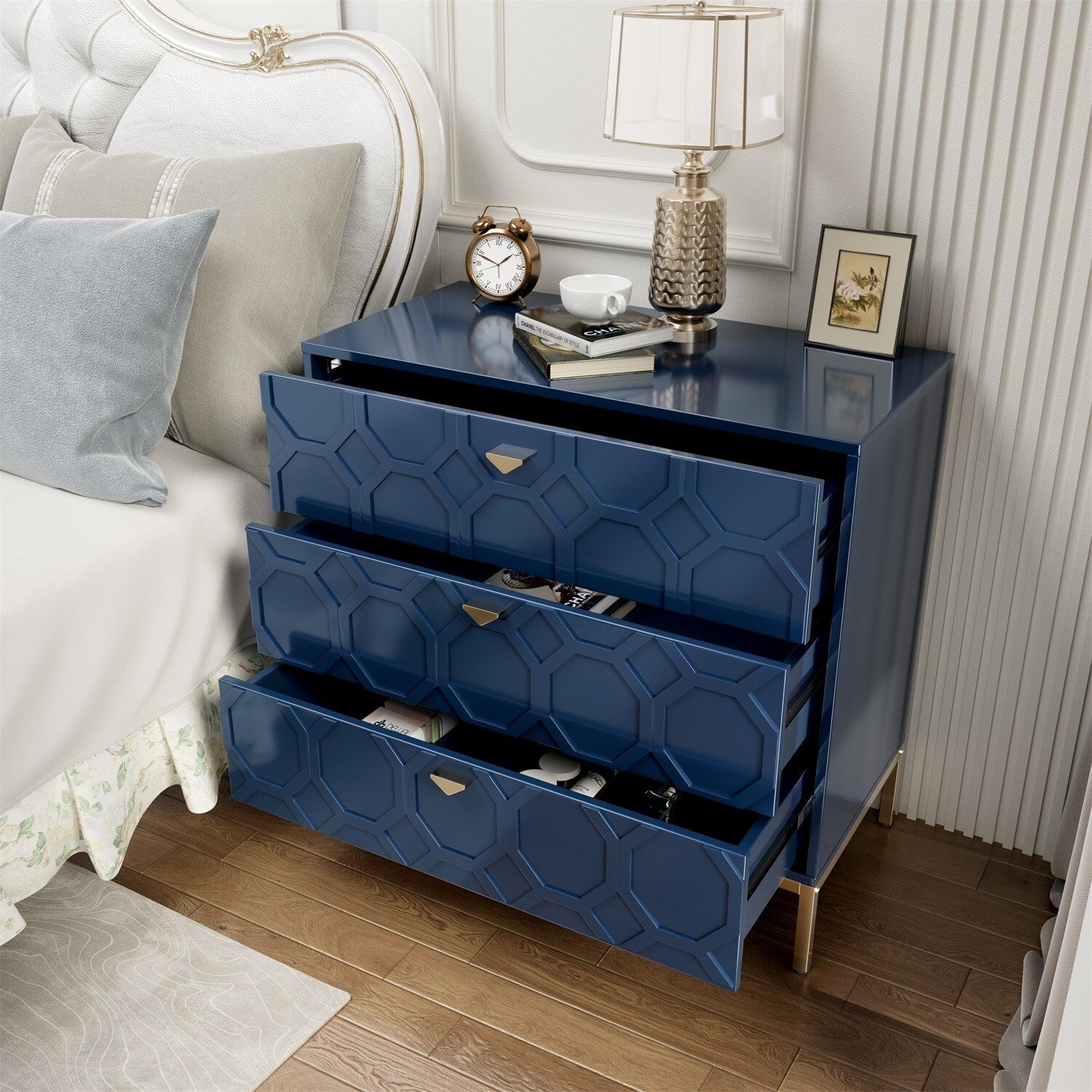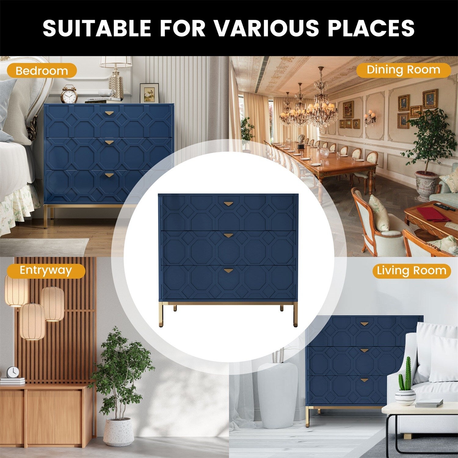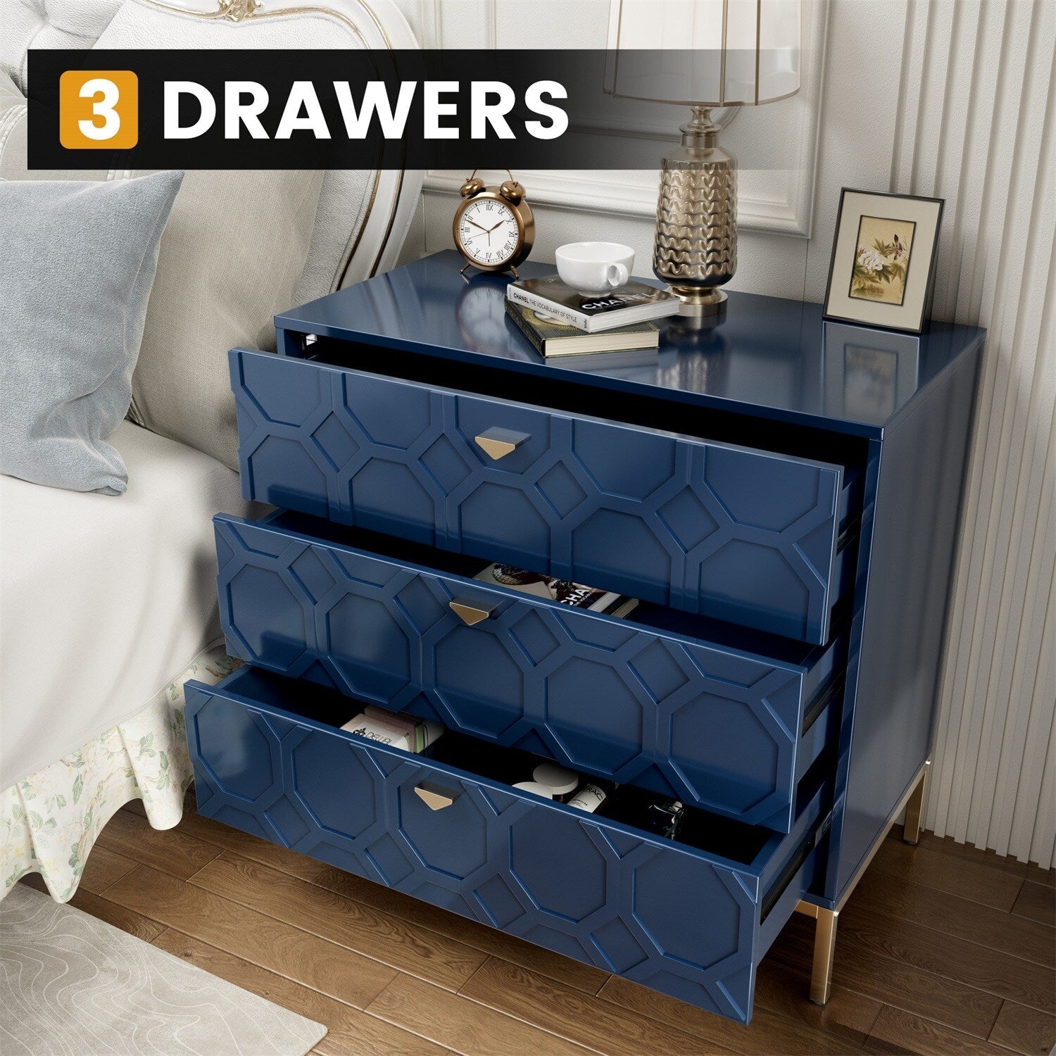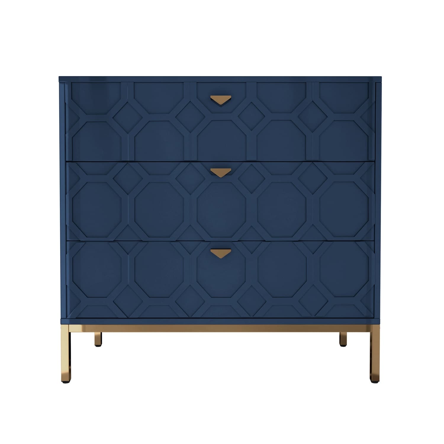 Elevate your space with the Mondawe 31.5" Blue 3-Drawer Cabinet. Impeccably designed, it pairs vibrant color with functionality, featuring striking honeycomb-patterned drawer fronts and luxe, gold-colored accents. Perfect for storing essentials, this cabinet ensures your home remains both stylish and organized.
