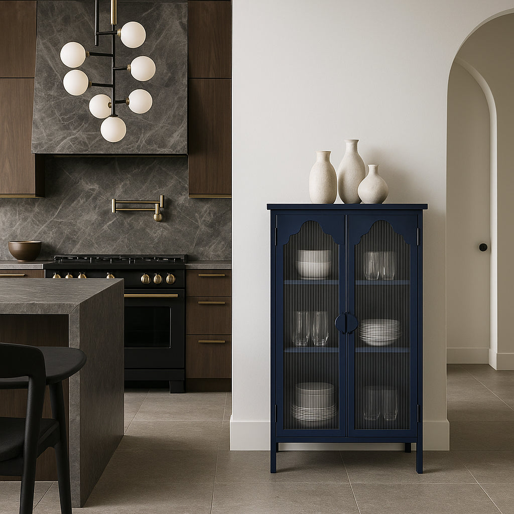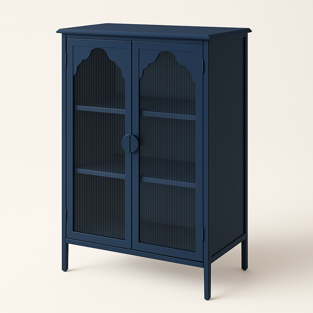 This blue glass door cabinet is a masterpiece of modern design, blending functionality with aesthetic appeal. Its arched corrugated glass doors create a captivating visual effect, while the high-gloss finish adds a touch of sophistication. Perfect for showcasing your favorite items, this cabinet transforms any room into a stylish haven. Pair it with minimalist decor to highlight its unique texture and make it the centerpiece of your space.