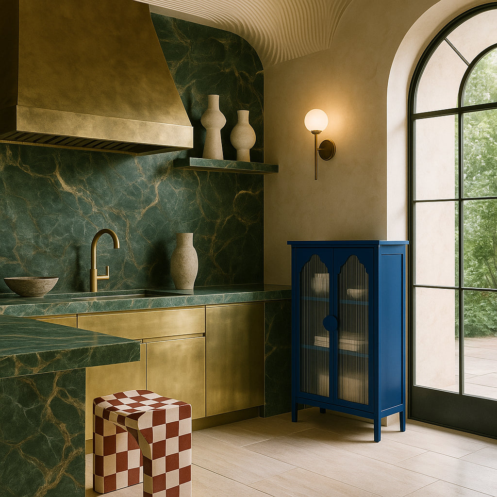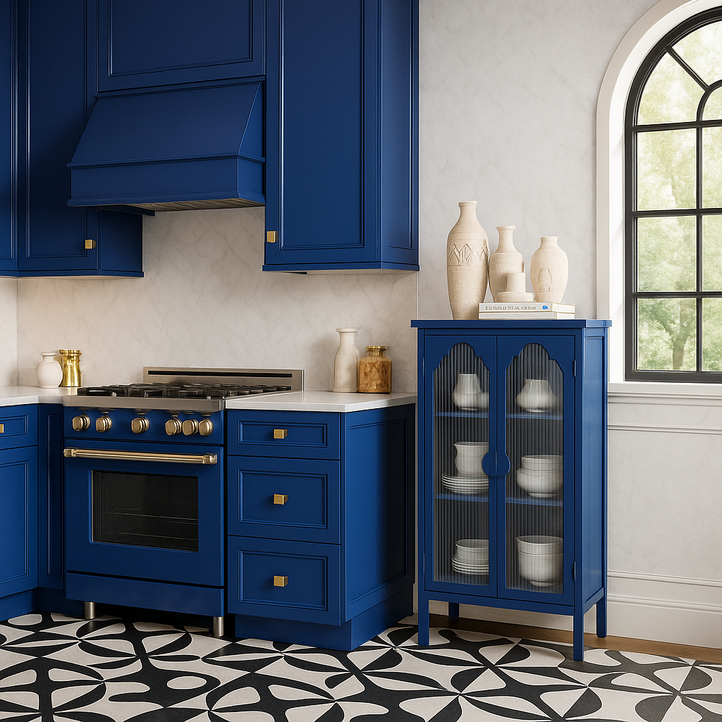 Enhance your kitchen with this stylish and functional blue glass door cabinet today!