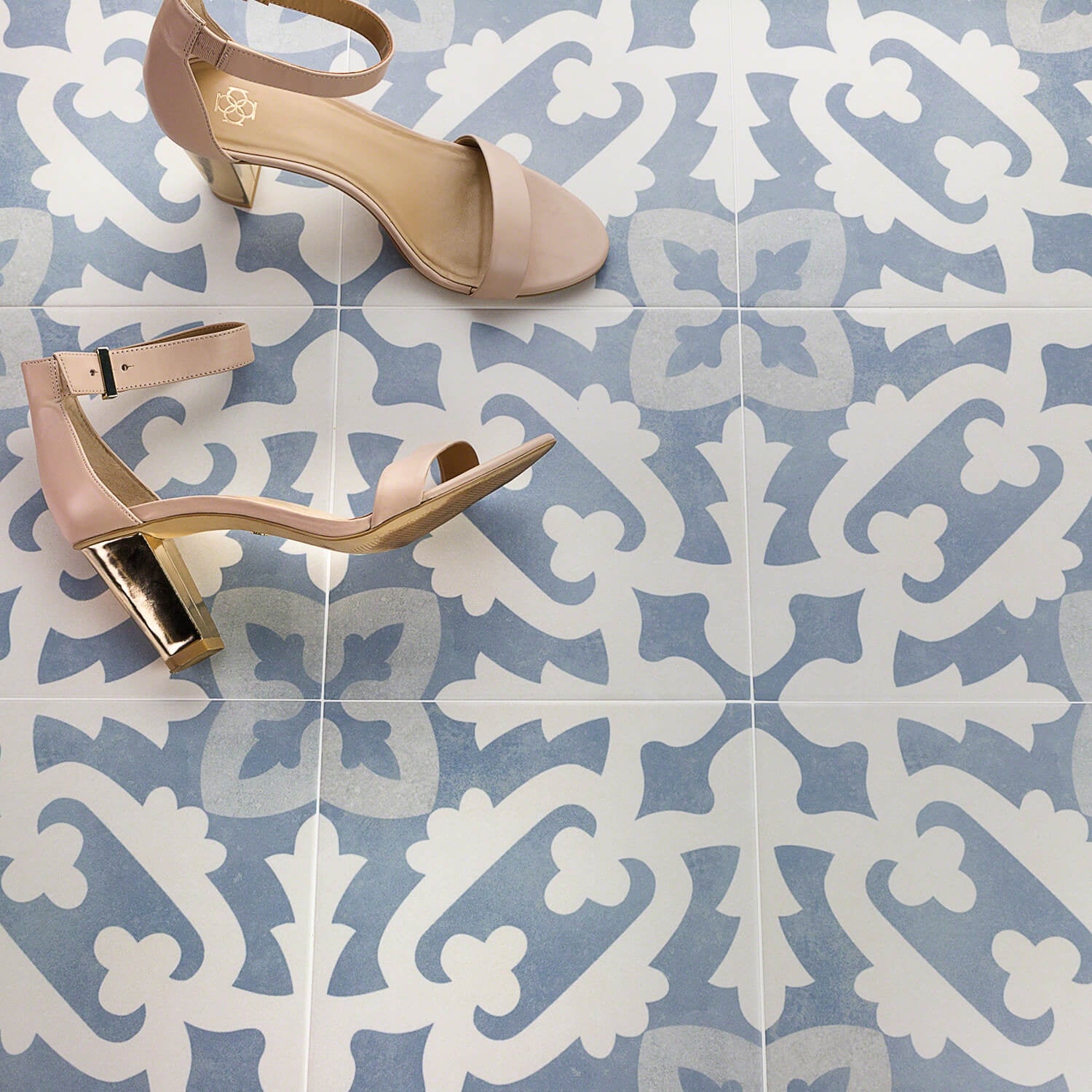 A matte-finished, encaustic-look porcelain tile in soft light blue, gray, and white, ideal for adding artistic pattern to floors and walls. Durable PEI 4 rating with frost, stain, and chemical resistance makes it suited for residential and commercial spaces, indoors or outdoors.