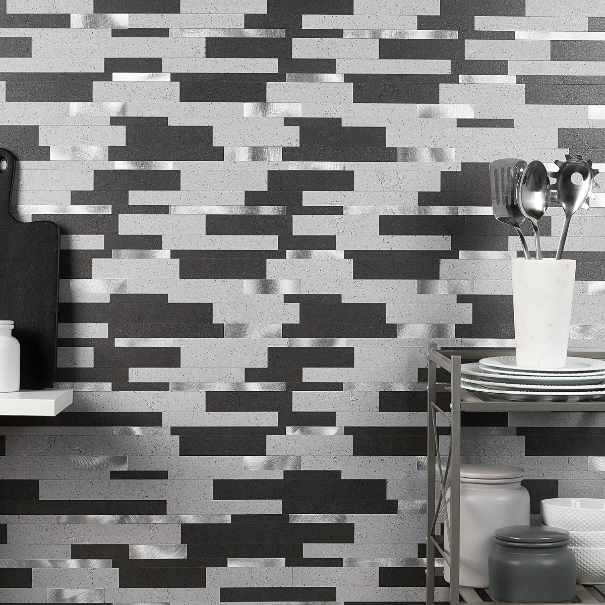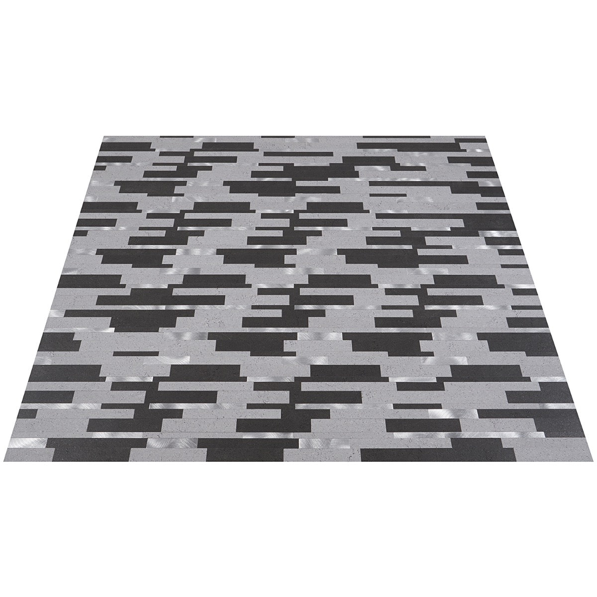 Upgrade walls with a modern metallic look using this SPC peel-and-stick mosaic tile. The brushed aluminum accents and concrete-look strips deliver a sophisticated, durable finish ideal for fast DIY backsplashes and bathroom walls.