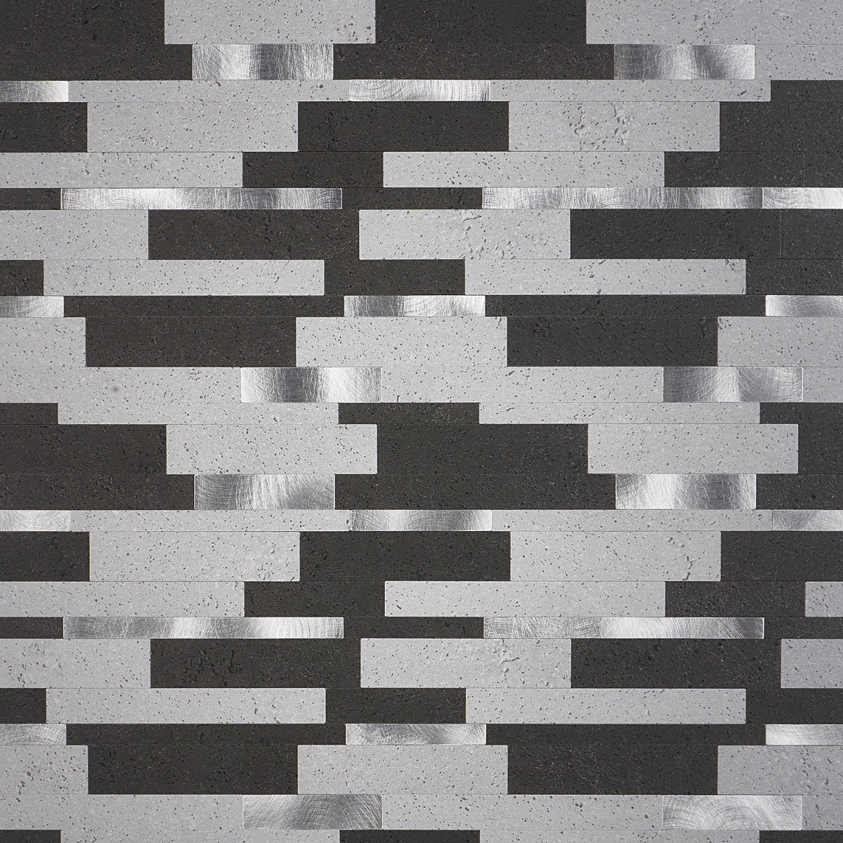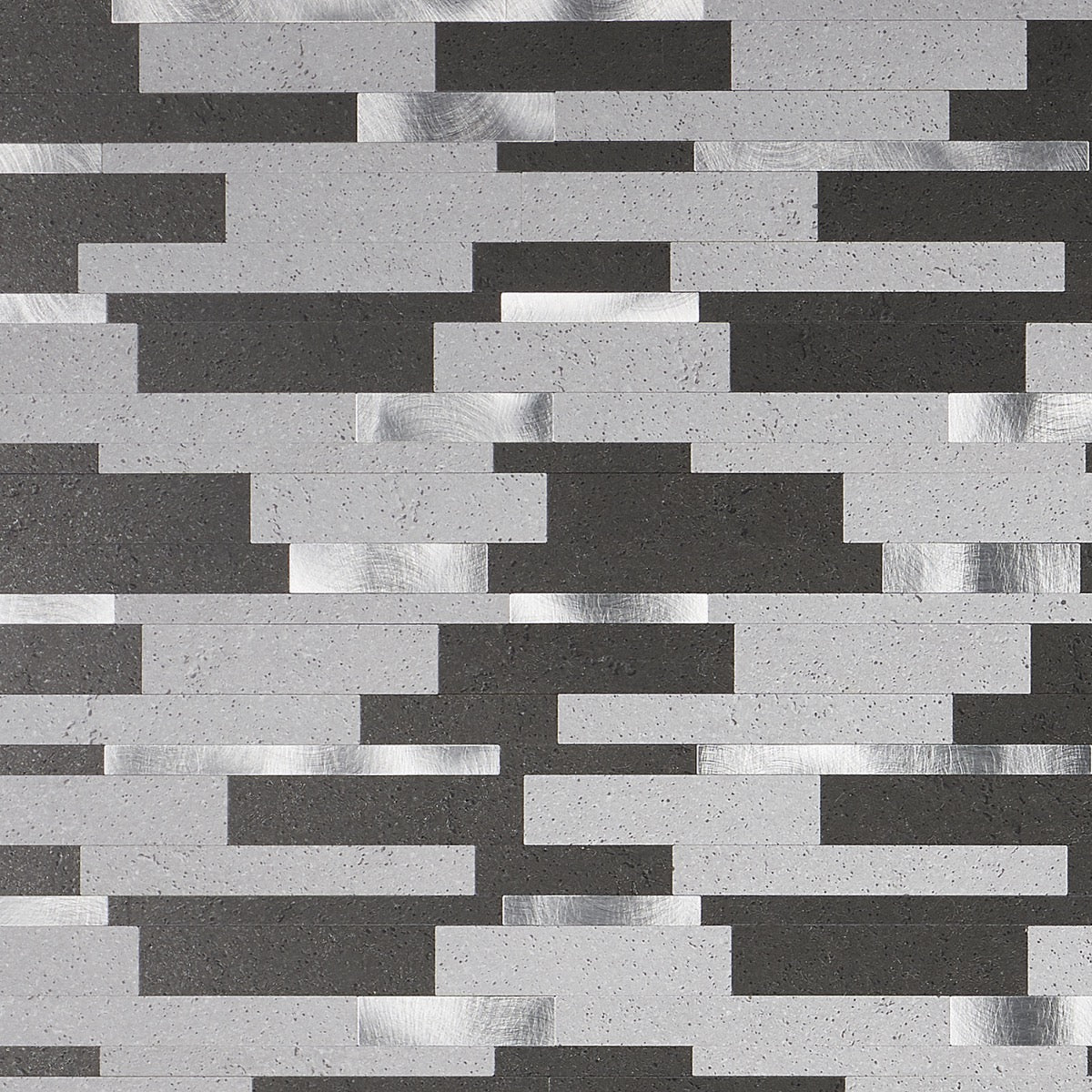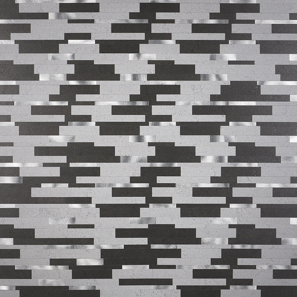 This mosaic layers graphite and soft concrete tones with flashes of brushed metal, creating a rhythmic, architectural backdrop. The slender linear strips feel tailored yet textural, catching light in the most alluring way. Pair it with matte black fixtures and warm wood to soften the cool glamour. It’s a chic essential for elevating everyday spaces with polished sophistication.