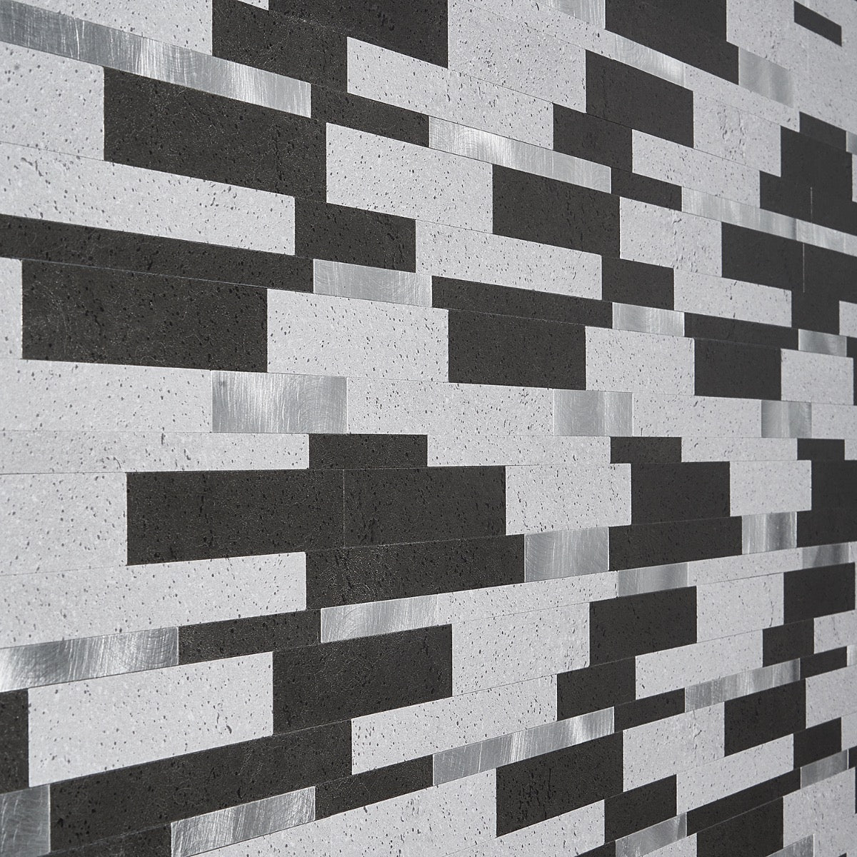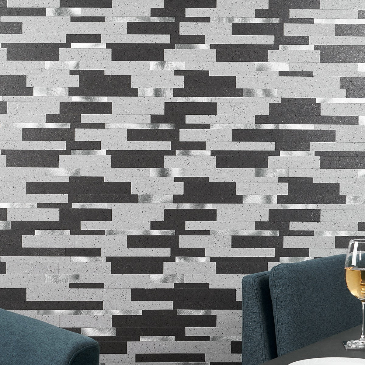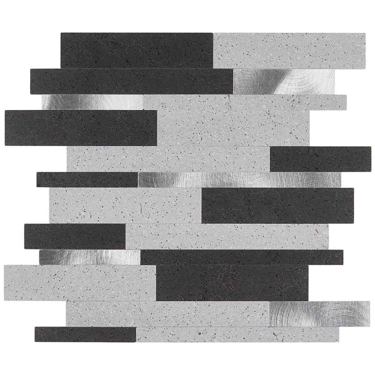 This mosaic layers graphite and soft concrete tones with flashes of brushed metal, creating a rhythmic, architectural backdrop. The slender linear strips feel tailored yet textural, catching light in the most alluring way. Pair it with matte black fixtures and warm wood to soften the cool glamour. It’s a chic essential for elevating everyday spaces with polished sophistication.