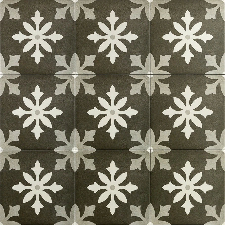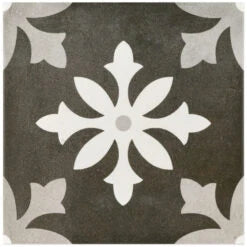 A 9x9 glazed porcelain tile with an encaustic, Mediterranean-inspired pattern in nero tones. Designed for stylish floors and walls, delivering the durability of porcelain with a distinctive decorative look.