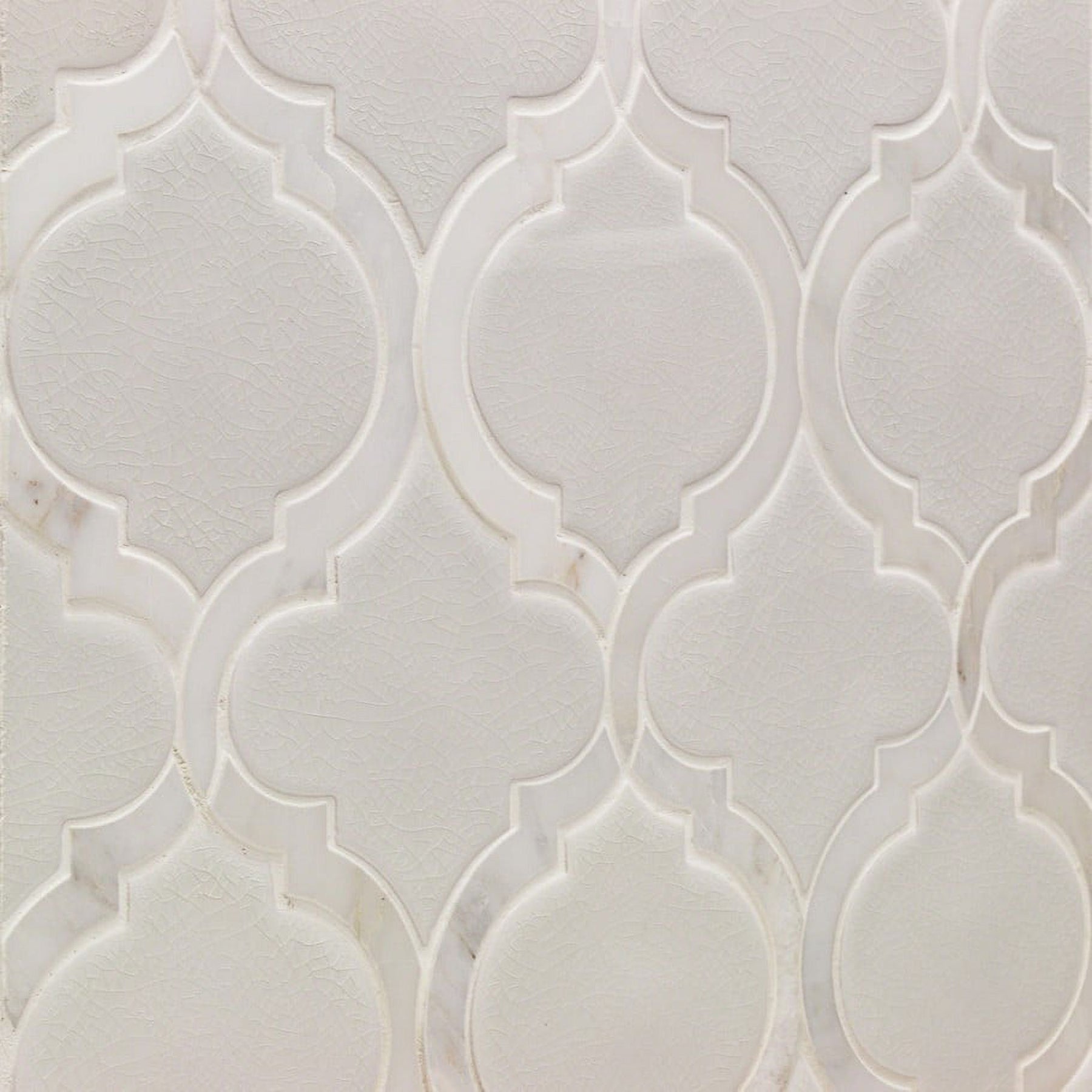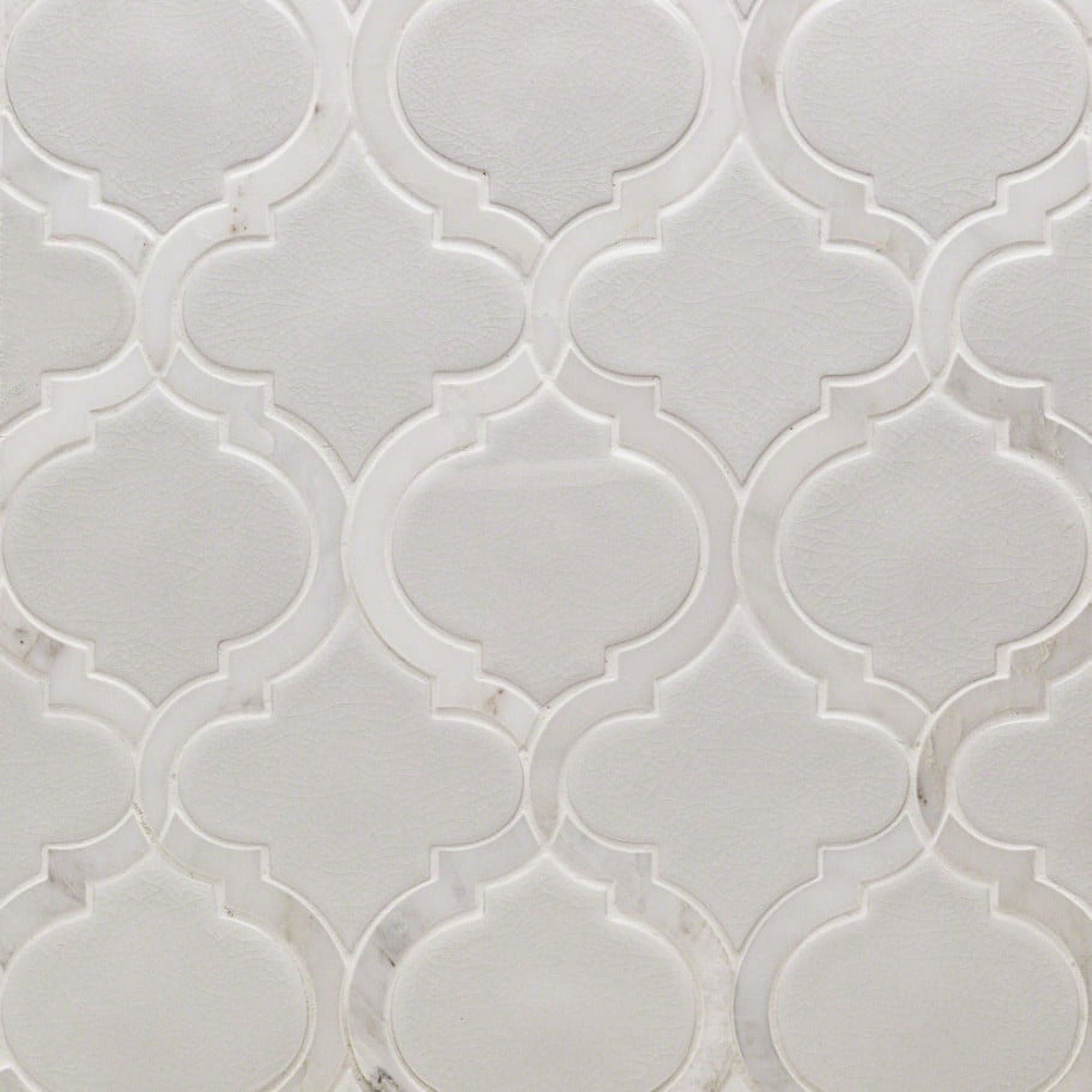 Elegant arabesque-shaped ceramic mosaic tiles in Glacier White, pre-mounted on a 10 in. x 12 in. sheet for easy wall installation. The glazed, crackle-look finish adds depth and character, ideal for backsplashes and bathroom walls.